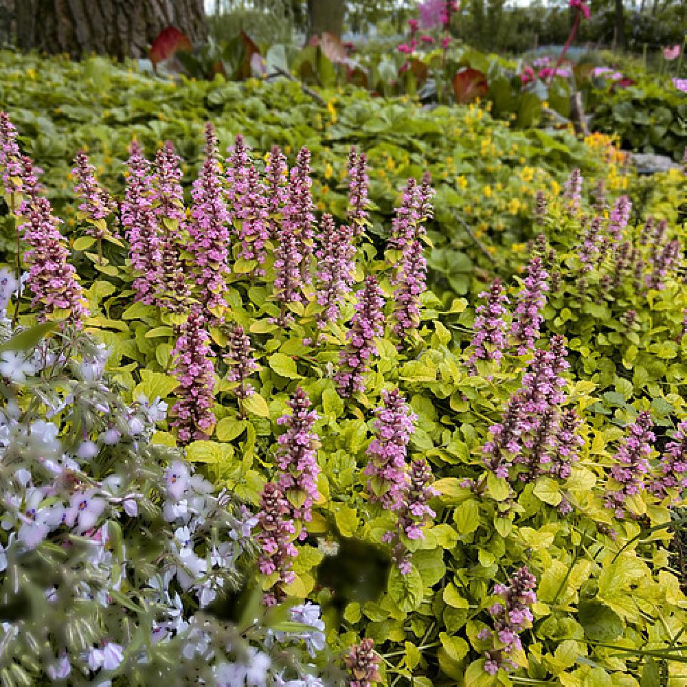 Eigenschaften: Der Günsel gehört zu den langlebigen, bodendeckenden Stauden, die freie Flächen unter Bäumen oder am Rand von Staudenbeeten wirkungsvoll begrünen. Der Kultivar ´GOLD CHANG‘ bildet einen niedrigen, dichten Teppich, der etwa 10–15 cm hoch wird. Während der Blütezeit erscheinen aufrechte Blütenähren von bis zu 25 cm Höhe mit außergewöhnlichen rosafarbenen Blüten, die einen reizvollen Kontrast zum goldgelben Laub bilden. Die Blütezeit liegt gewöhnlich zwischen April und Juni, in dieser Zeit wirkt die Pflanze besonders frisch und dekorativ.