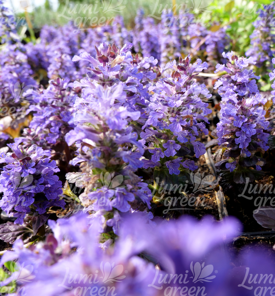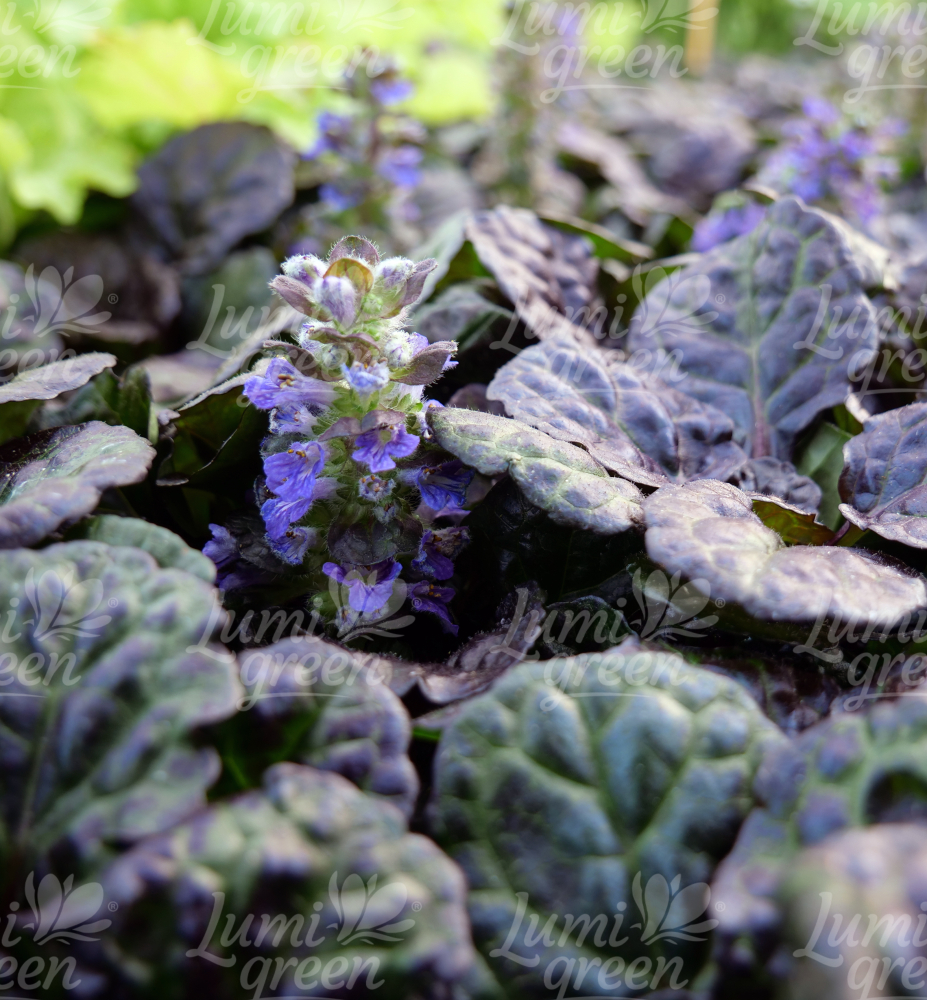 Eigenschaften: Der Kriechender Günsel ´BLACK SCALLOP´ ist eine bodendeckende Staude, die schnell einen niedrigen, dichten Teppich aus Blättern bildet. Diese sind auffallend glänzend und dunkelmahagonifarben. Ab Mai erscheinen über den Blättern blaue, halskrautähnliche Blüten. Die Pflanze erreicht eine Höhe von 10–20 cm.