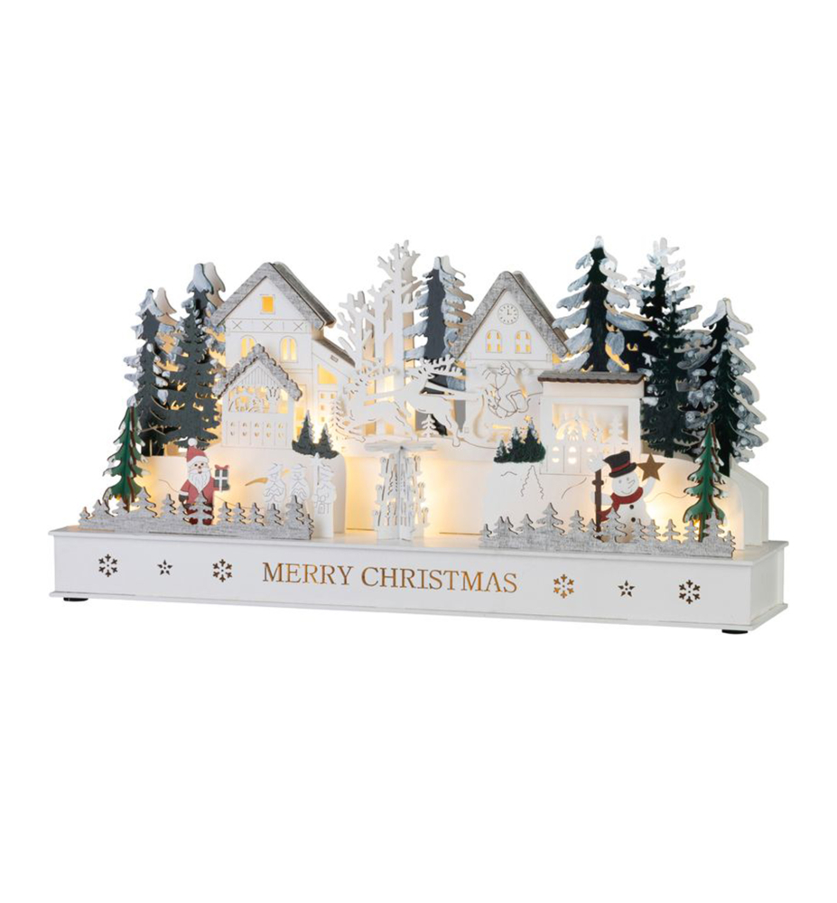 Eigenschaften: Ein wunderschönes, weiß beleuchtetes Holzdorf ist eine traditionelle Weihnachtsdekoration. Die detailreichen Häuser, Bäume und Winterfiguren werden von 15 warmweißen LED-Lichtern ergänzt, die für eine angenehme, festliche Beleuchtung sorgen. Die Dekoration eignet sich ideal für Tisch, Regal oder unter dem Weihnachtsbaum.