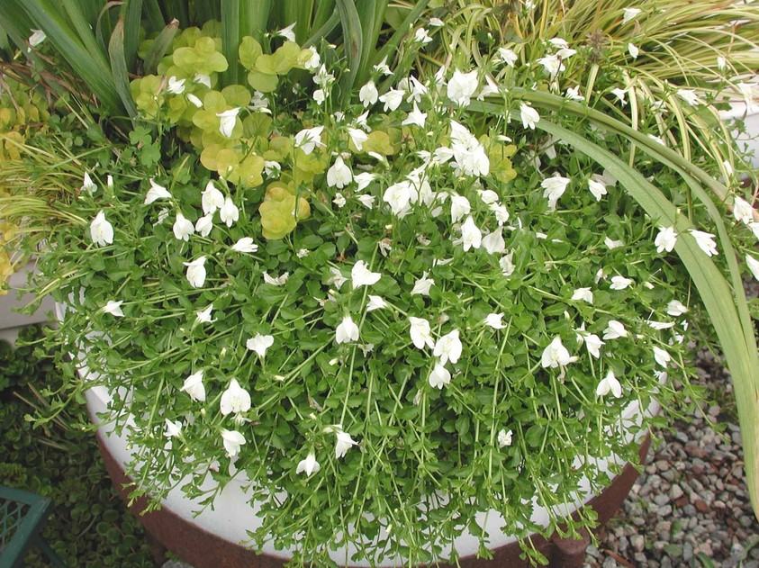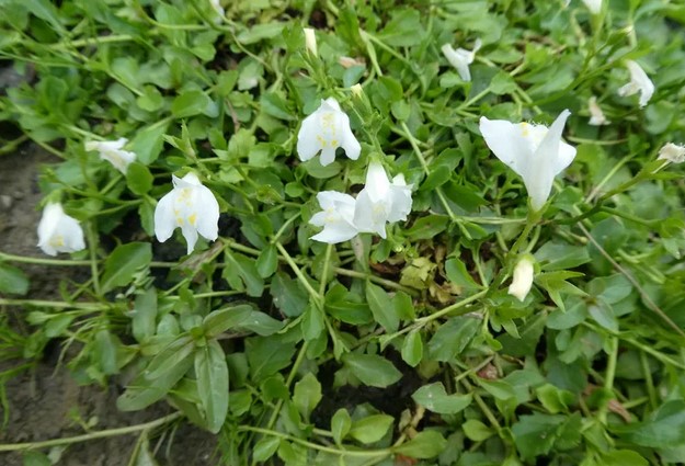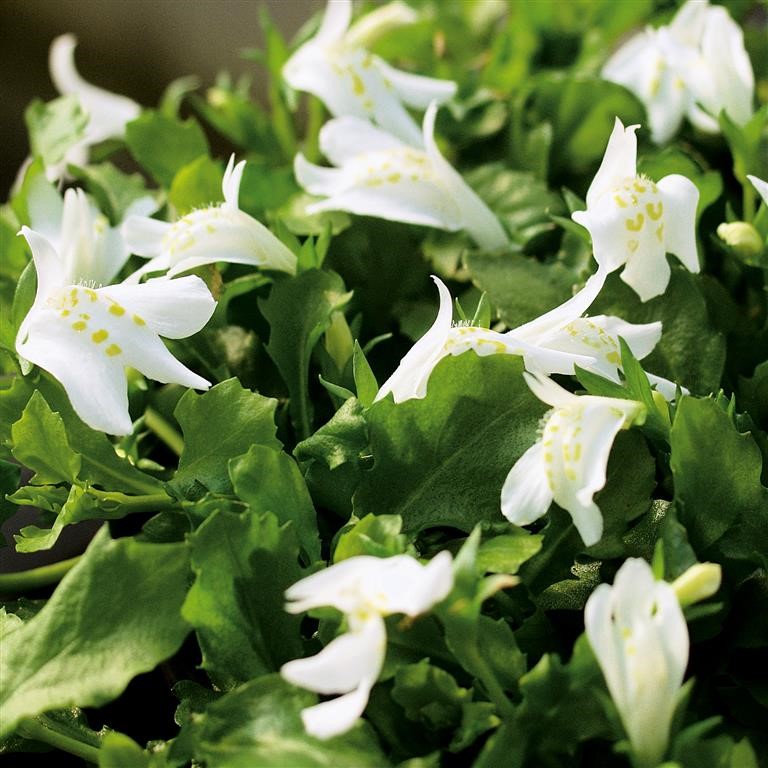 Eigenschaften: Lippenmäulchen kommt ursprünglich aus Australien, Neuseeland und Asien. Es handelt sich um eine frostbeständige Bodendeckerstaude, die schnell wächst und einen grünen Teppich bildet. Die Blätter sind schmal, tiefgrün. Sie erreicht eine Höhe von 4 - 7 cm. Die Sorte ´ALBUS´ blüht von Mai bis Juli mit attraktiven weißen Blüten und auffälligen gelben Staubgefäßen.