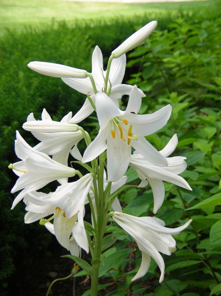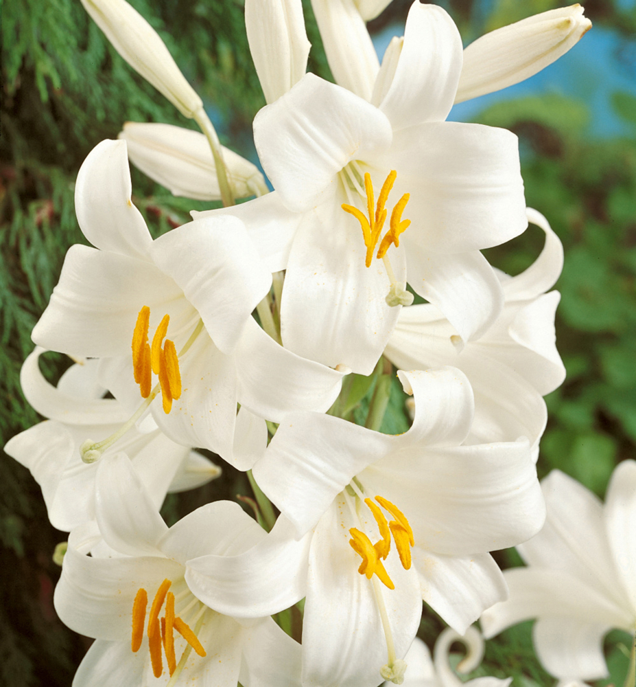 Eigenschaften: Die beliebte weiße Lilie, die einst in keinem Garten fehlen durfte, hat nicht nur wunderschöne Blüten mit intensivem Duft, sondern wird auch wegen ihrer medizinischen Wirkung angebaut. Die Blüte besteht aus sechs weißen, regelmäßigen Blütenblättern, in deren Mitte mit gelbem Pollen bedeckte Stäbchen stehen. Die Lilie wächst aufrecht an blättrigen Stängeln, die aus einer Rosette hellgrüner Blüten entstehen.