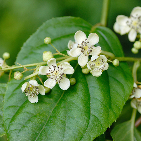 Schnell wachsende männliche Mini-Kiwi mit cremeweißen Blüten, bestäubt von 6–8 Pflanzen.