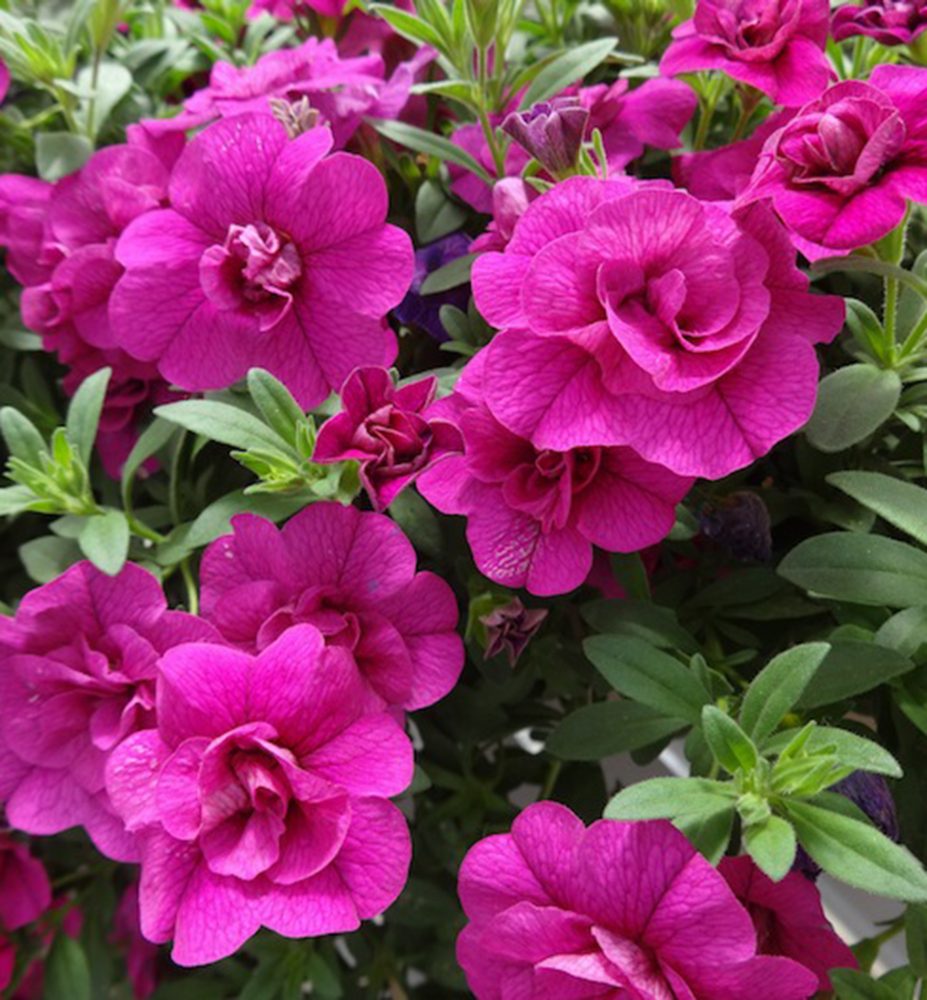 Eigenschaften: Die Mini-Petunie ´ALOHA DOUBLE® PURPLE‘ bildet den ganzen Sommer über auffällige, dicht gefüllte Blüten in intensiv violett-rosa Farbtönen und schmückt damit Balkone und Terrassen.