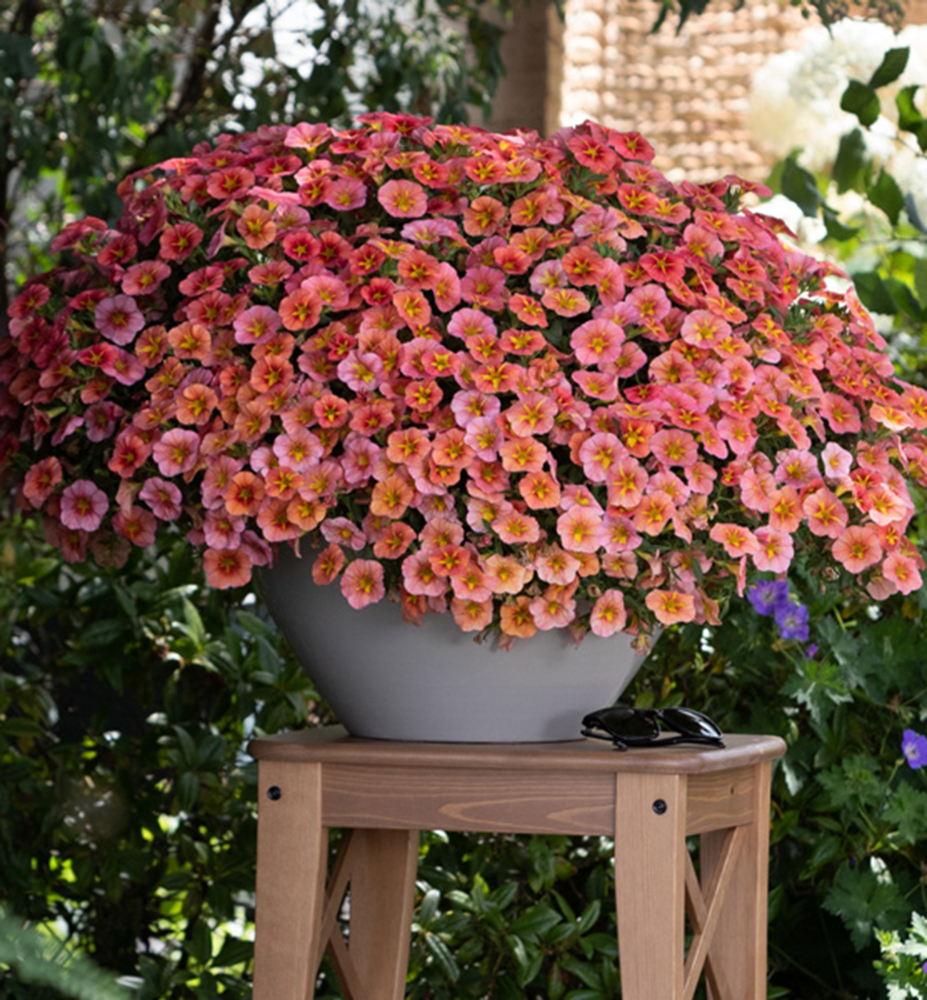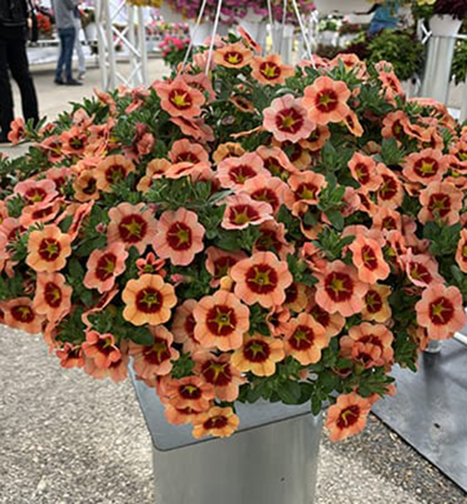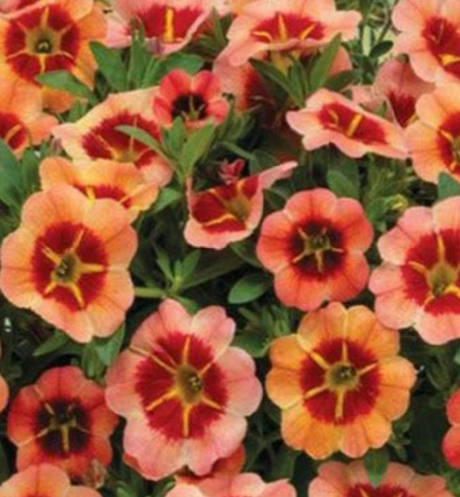 NEU! Attraktive Mini-Petunie mit orangefarbenen Blüten und dunklerem Zentrum.