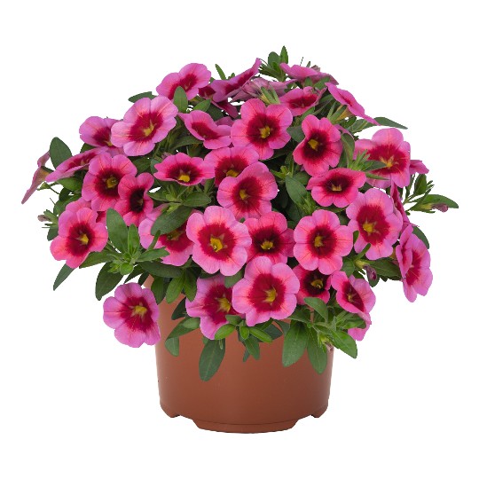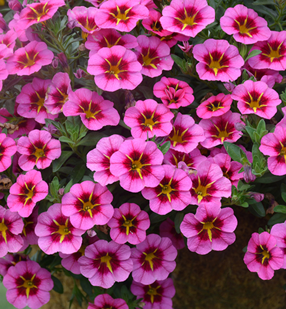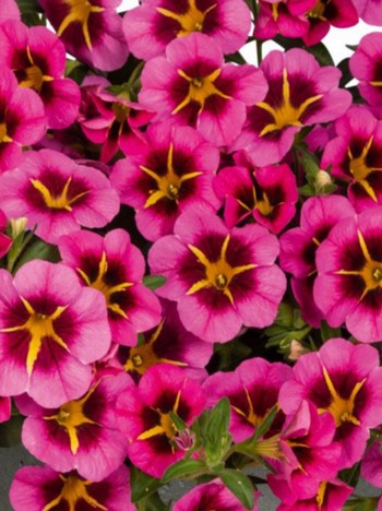 NEU! Eine auffällige Mini-Petunie mit rosa Blüten und einem markanten gelben Muster.