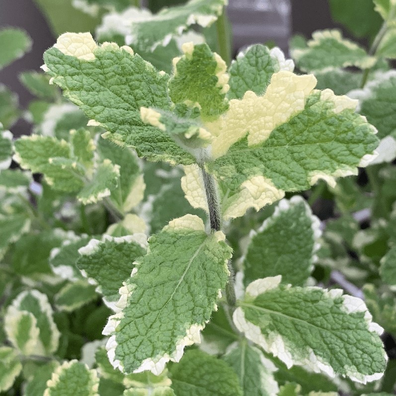 Eigenschaften:Die kleinen Blätter dieser Sorte sind matt und haben eine tiefgrüne Farbe mit einem weißen Rand. Die Blätter haben ein intensives Aroma, das an den Geruch von Ananas erinnert. Die Minze „ANANSMINZE“ wächst langsamer und erreicht eine Höhe von 25–30 cm. Sie blüht von Juli bis August mit blassrosa Blüten.