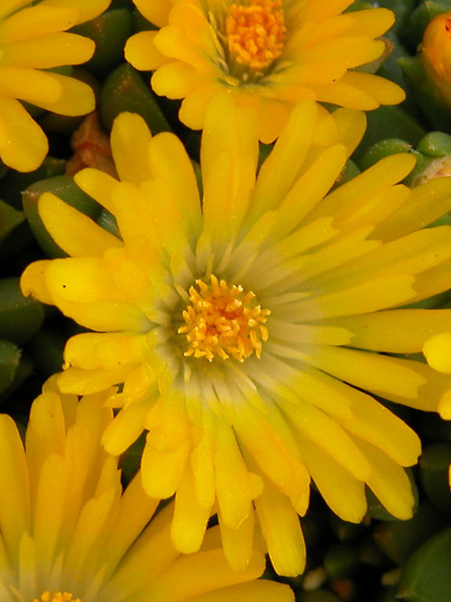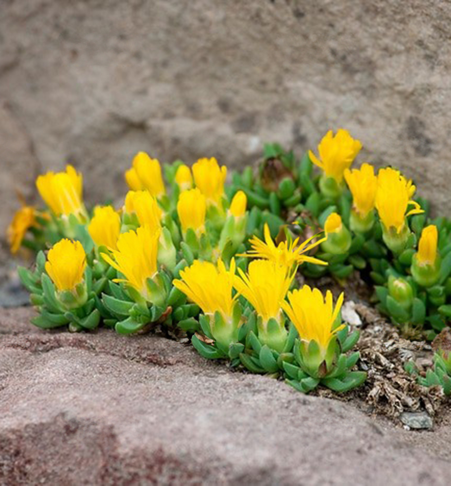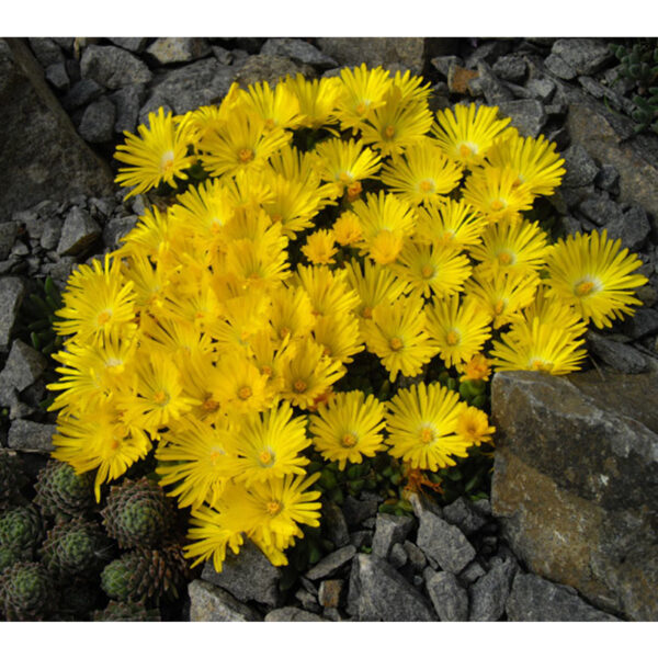 Eigenschaften: Die Mittagsblume ´GOLDEN NUGGET´ ist eine relativ schnell wachsende Steingartenpflanze. Sie blüht ab Frühsommer mit auffälligen, leuchtend gelben, gänseblümchenförmigen Blüten. Die fleischigen grünen Blätter besitzen hervorragende bodendeckende Eigenschaften. Die Pflanze ist winterhart bis -20 °C und eignet sich ideal für Steingärten und die Begrenzung von Beeten.