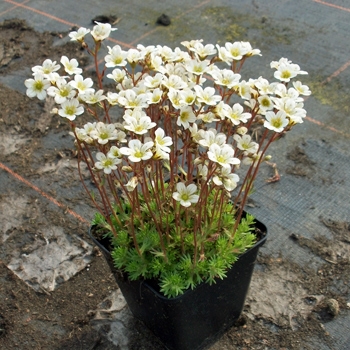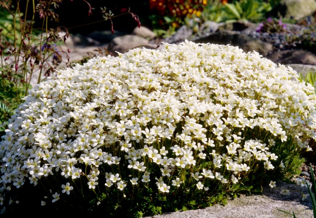 Beliebter schneeweißer Moos-Steinbrech, der dichte, kompakte Kissen bildet.