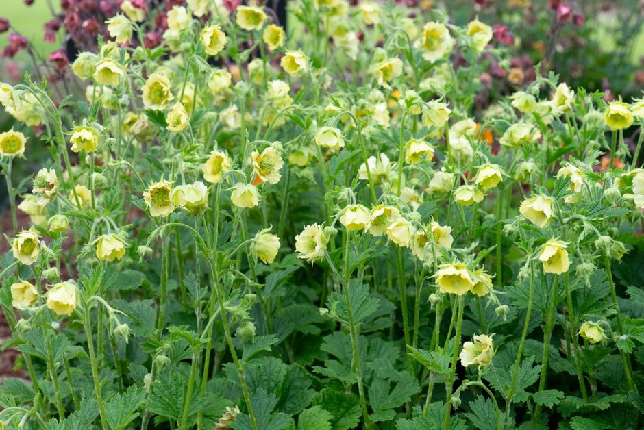 Eigenschaften: Nelkenwurz ´TALES OF HEX´ ist eine außergewöhnliche Sorte, die mit dem renommierten Garden Merit Award der Royal Horticultural Society (RHS) ausgezeichnet wurde. An einem 50 cm hohen, dünnen Stiel entwickeln sich große, gefüllte Blüten, die eine sanfte zitronengelbe Farbe haben. Die Blütenblätter sind sehr schön gewellt und umgeben die grünliche Mitte. Die gezackten, mittelgrünen Blätter bilden einen niedrigen, kompakten Haufen. Nelkenwurzen werden vor allem in traditionellen Staudenbeeten verwendet, kommen aber auch zunehmend in modernen Gärten zum Einsatz.