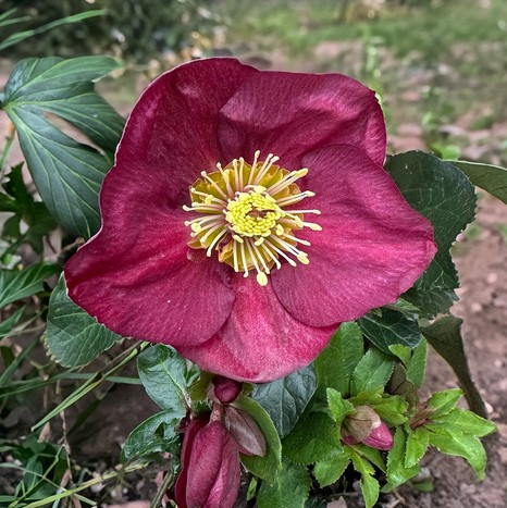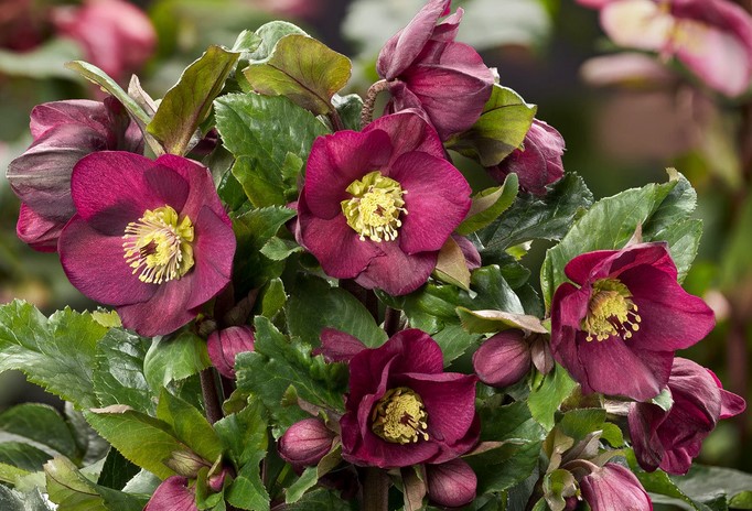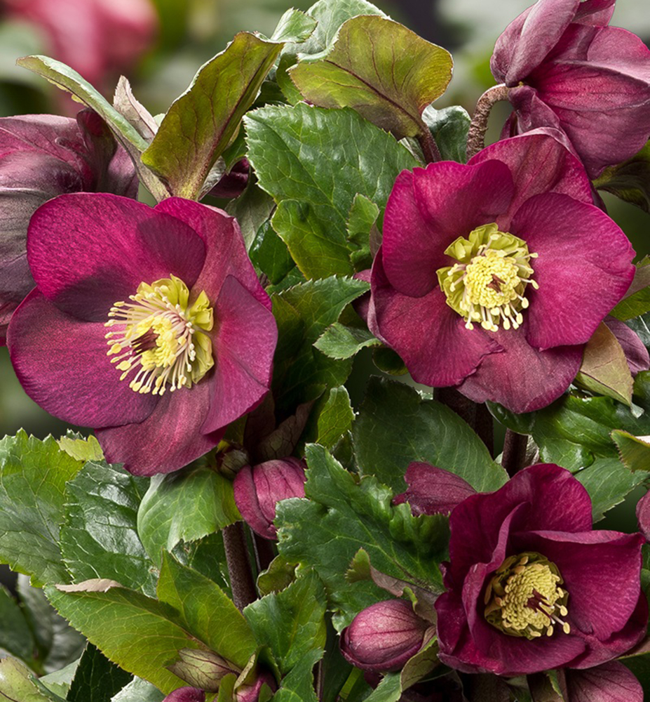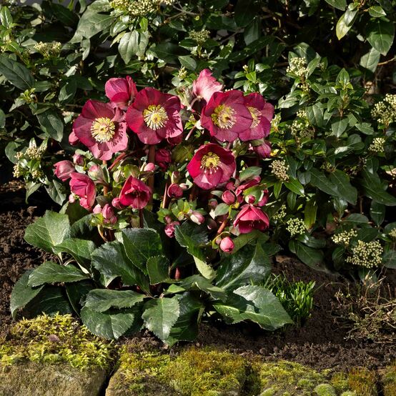 Eigenschaften: Die Nieswurz 'ICE N' ROSES® BENNOTA' ist eine elegante, immergrüne Staude, die durch ihre dunkel-himbeerroten Blüten mit kontrastierenden gelben Staubgefäßen auffällt. Die Blüten erscheinen von Januar bis ins späte Frühjahr und bringen Farbe in den Garten während der kalten Monate, wenn die meisten Pflanzen noch nicht geblüht haben. Sie wird 40–60 cm hoch und bildet kompakte Büschel dunkelgrüner, ledriger Blätter, die das ganze Jahr über dekorativ aussehen.