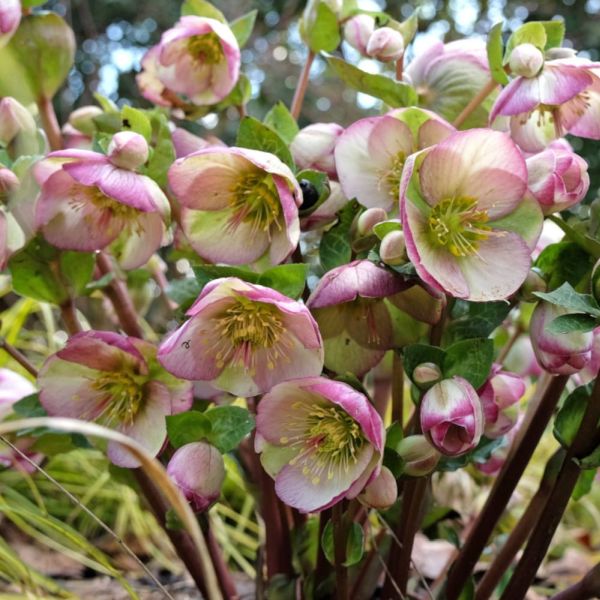 Eine elegante Christrose mit cremefarbenen Blüten und unregelmäßiger rosa Färbung.