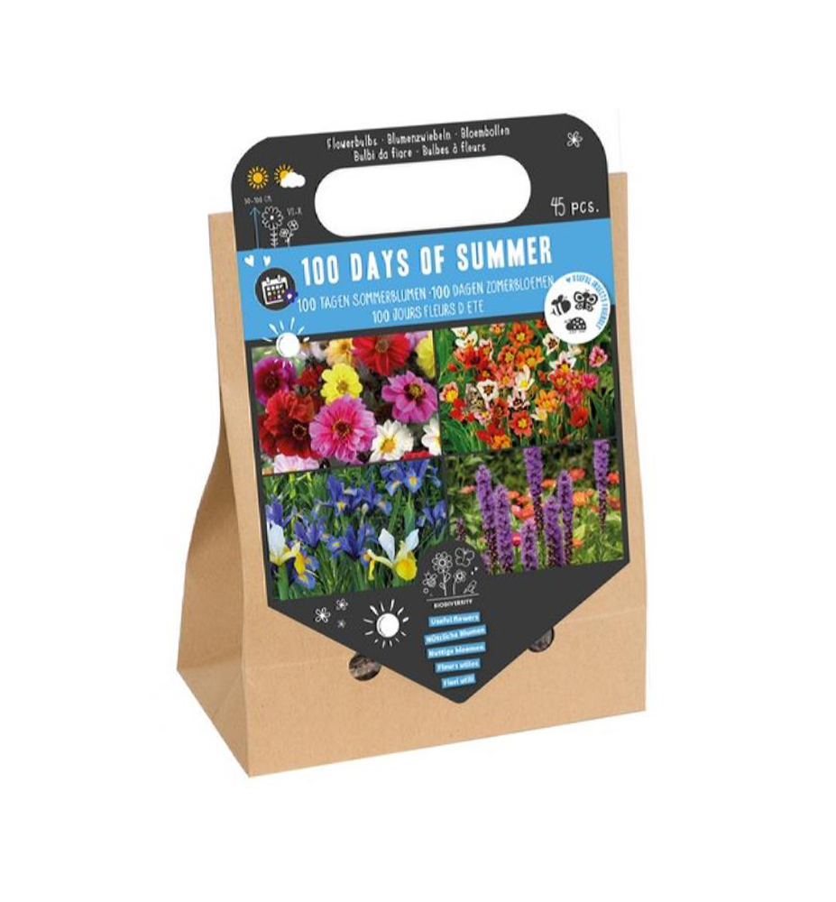 Eigenschaften: Papiersack mit einer speziellen Auswahl an Zwiebelpflanzen für Ihren Garten. Die Mischung enthält 45 Arten, die eine Höhe von 30–100 cm erreichen. Der Sack enthält: 2 Stück Dahlie ‚Red Skin‘, 20 Stück Zigeunerkraut, 12 Stück Iris ‚Hollandica Mix‘, 11 Stück Blauer Ehrenpreis ‚Liatris spicata Blue.