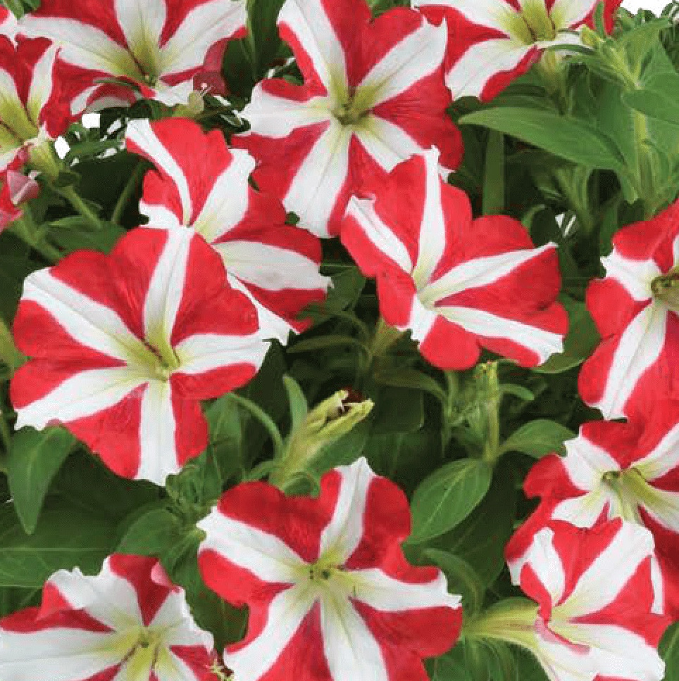 Eigenschaften: Die Petunie ´AMORE® KING OF HEARTS‘ bildet auffällige Blüten, die durch fünf markante rote Herzen mit kontrastierend weißer Umrandung geprägt sind.