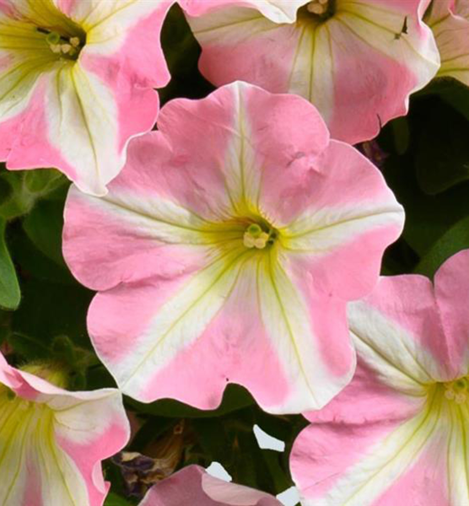 Eigenschaften: Die Petunie ´AMORE® PRINCESS PINK‘ bildet einzigartige Blüten an halbüberhängenden Trieben. Die Blüten zeichnen sich durch fünf romantische, rosafarbene Herzen aus, die kontrastierend weiß umrandet sind.
