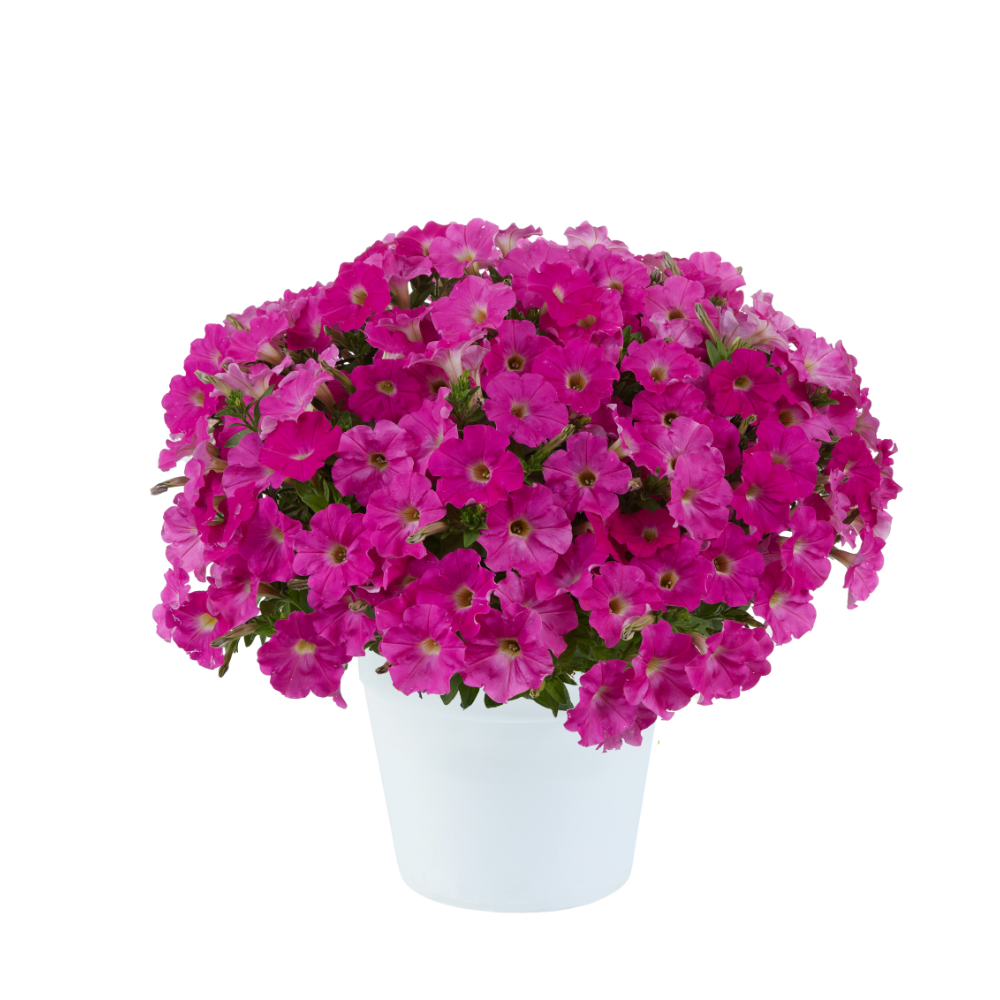 Tiefrosa, halbzwergwüchsige Petunie mit früher und üppiger Blüte.