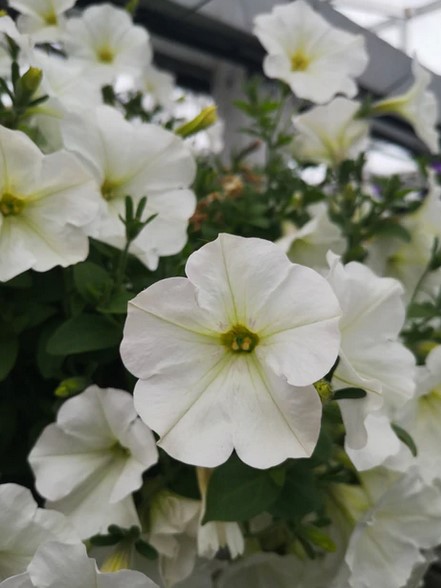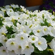 Wunderschöne weiße, halb hängende Petunie, ideal für vielfältige Farbkombinationen.