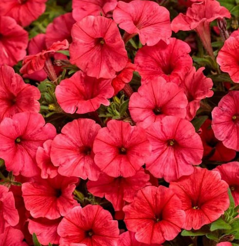 Attraktive, reich blühende Petunie mit kleinen korallenroten Blüten.