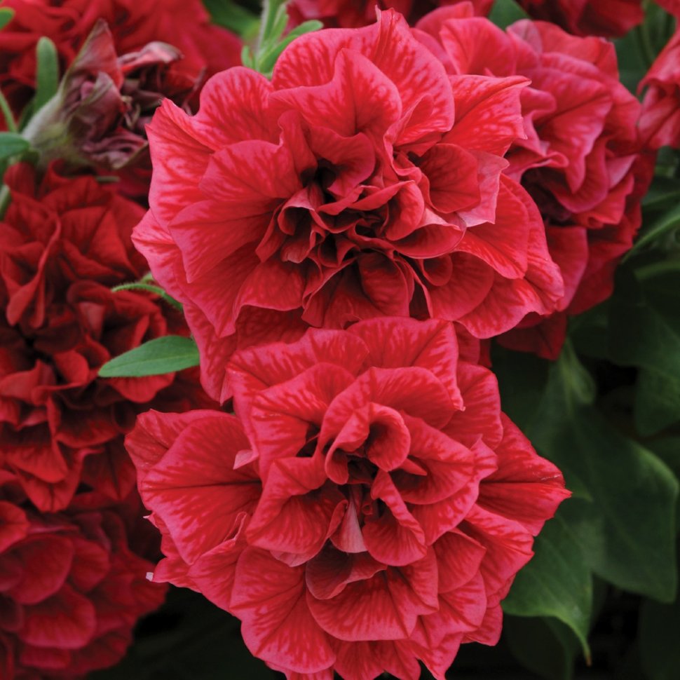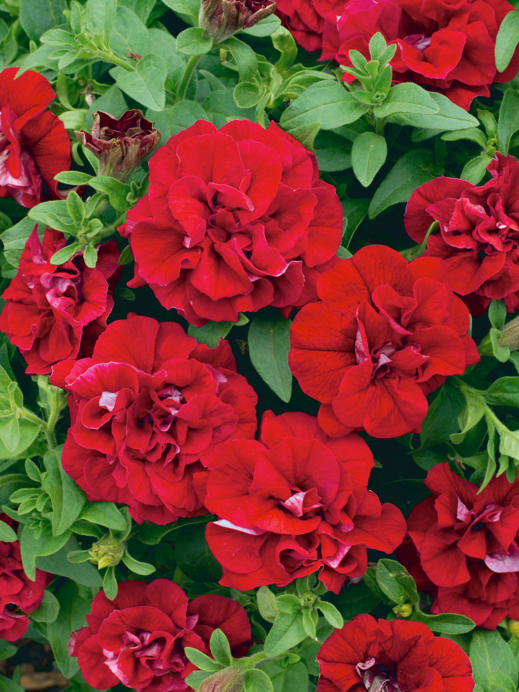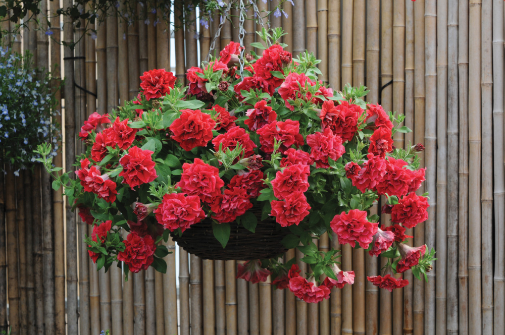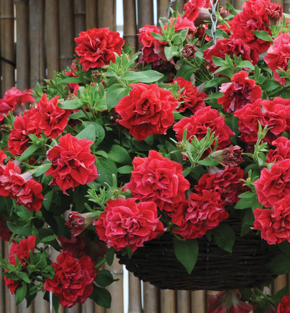 Überhängend wachsende, duftende Petunie mit gefüllten Blüten in Rot- und Rosatönen.