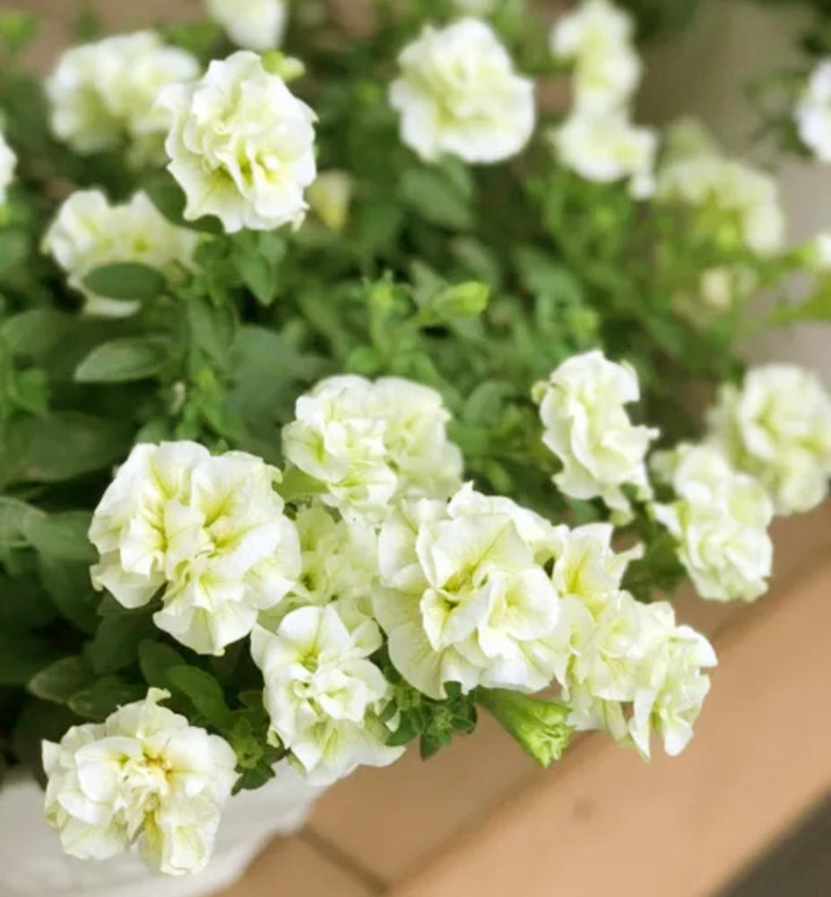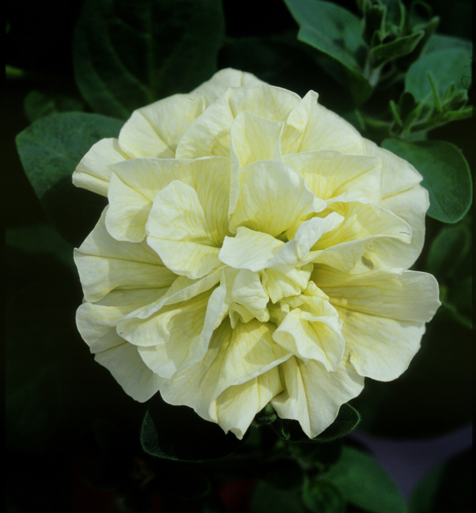 Wunderschöne Petunie mit üppigen, gewellten Blüten in sanftem Cremegelb.