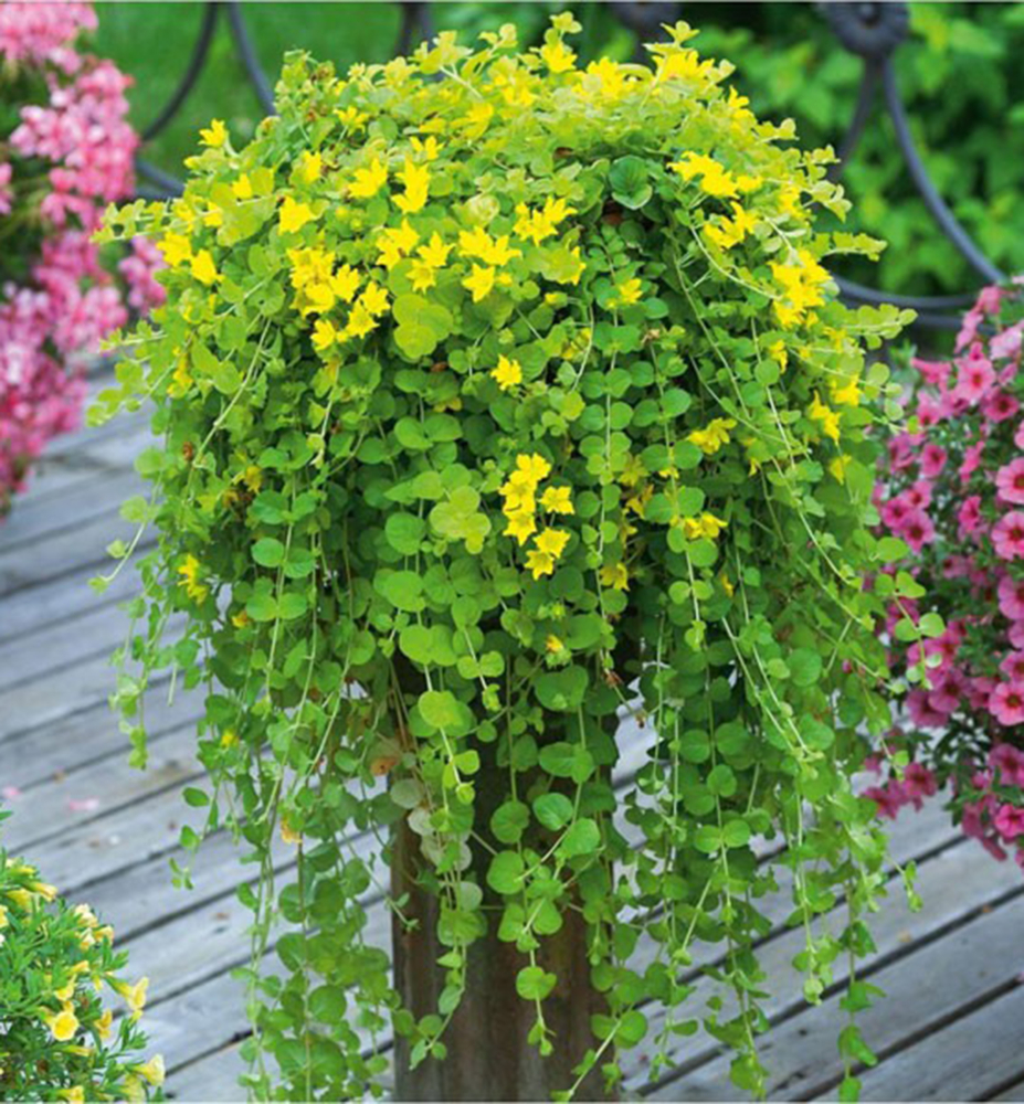 Eigenschaften: Pfennigkraut ist in Europa, Nordamerika, Japan, Australien und Neuseeland weit verbreitet und kommt in feuchten Lebensräumen, auf Feldern, in Auwäldern sowie an Flussufern und Stauseen vor. Es kann auch direkt im Wasser wachsen. Es handelt sich um eine niedrig wachsende, feuchtigkeitsliebende, kriechende Staude. Die gegenständigen Blätter sind rundlich und hellgrünlich-gelb gefärbt. Ab Juni erscheinen kleine, leuchtend gelbe Blüten. Frosthart bis -28 °C. Zierpfennigkraut eignet sich auch für Balkone in Kübeln und hängenden Töpfen, wo es bis zu 1 m lange Überhänge bildet.