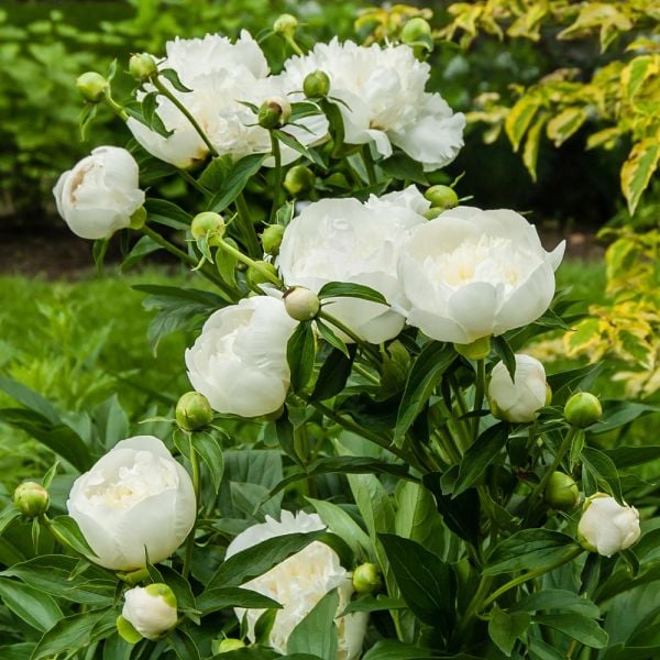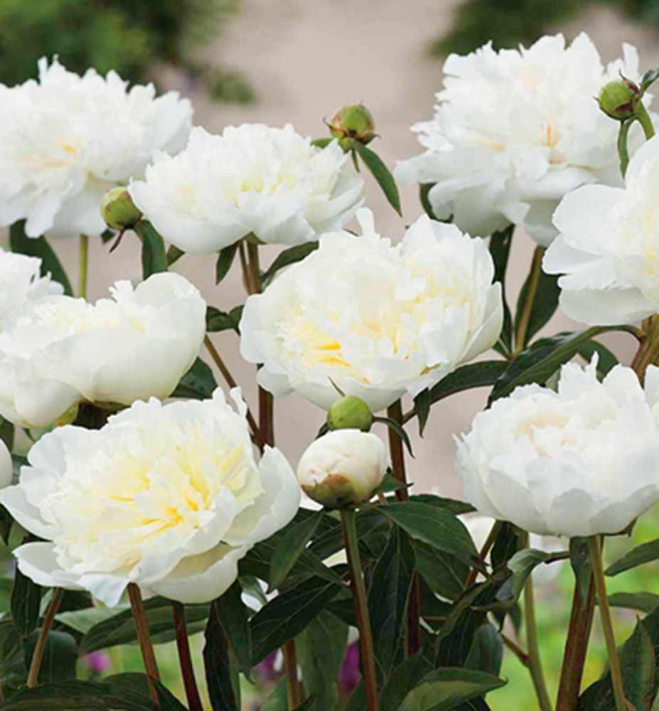 Eigenschaften:Die Blüten der Pfingstrose „DUCHESSE DE NEMOURS“ haben eine schneeweiße Farbe, zur Mitte hin verfärben sie sich in buttergelbe Farbtöne. Sie verbreiten einen angenehmen Duft um sich herum, dank ihrer langen Haltbarkeit und starken Stiele eignen sie sich zum Schneiden in eine Vase. Die Stängel werden bis zu 1 m hoch und neigen nicht zum Absturz. Die Laubblätter sind geteilt, mittelgrün, ziehen sich für den Winter zurück und treiben im zeitigen Frühjahr weinrote Blätter aus. Pfingstrosen kommen in einem Staudenbeet oder als Ergänzung zwischen Büschen und Bäumen sehr gut zur Geltung.