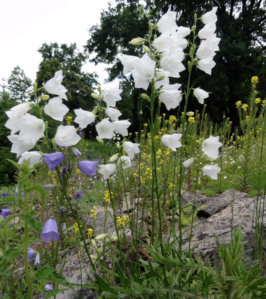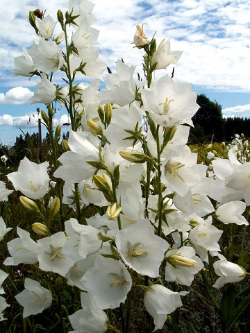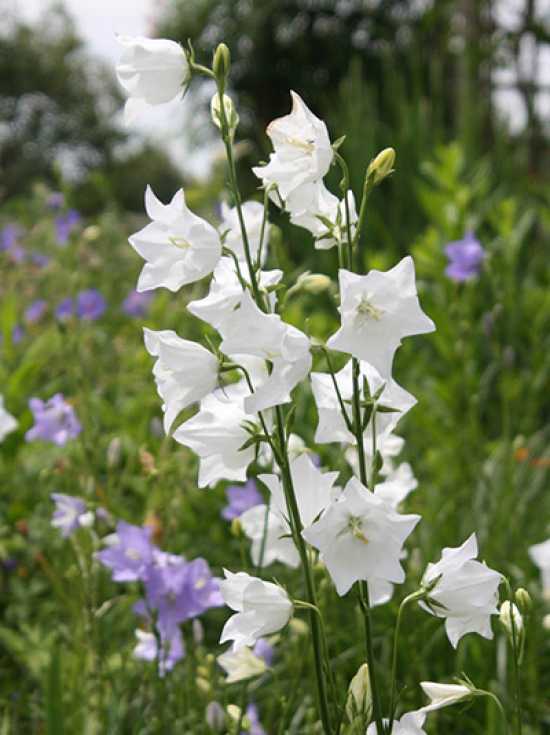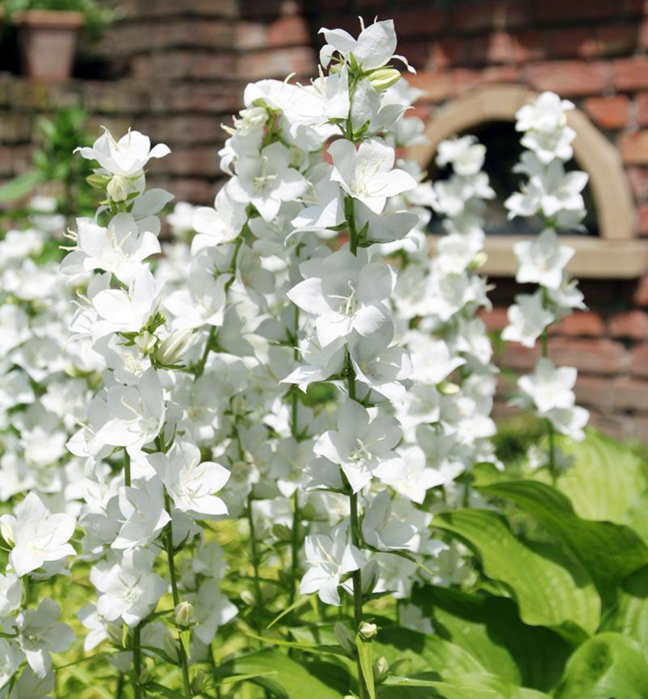 Eigenschaften: Die pfirsichblättrige Glockenblume ´Grandifolia Alba´ blüht mit zahlreichen großen, schalenförmig geöffneten, schneeweißen Blüten. Die dunkelgrünen, glänzenden, lanzettlichen Blätter wachsen in einer bodennahen Rosette. Die Sorte eignet sich besonders gut für Pflanzungen zusammen mit Gänseblümchen, Gräsern oder Pfingstrosen. Die Blüten sind auch hervorragend für den Schnitt geeignet.