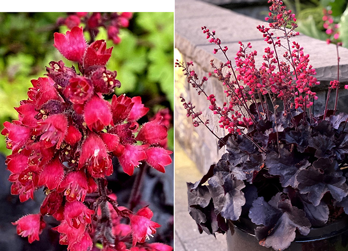 Ein niedrig wachsendes Purpurglöckchen mit schokoladenbraunen Blättern und kräftig roten Blüten.