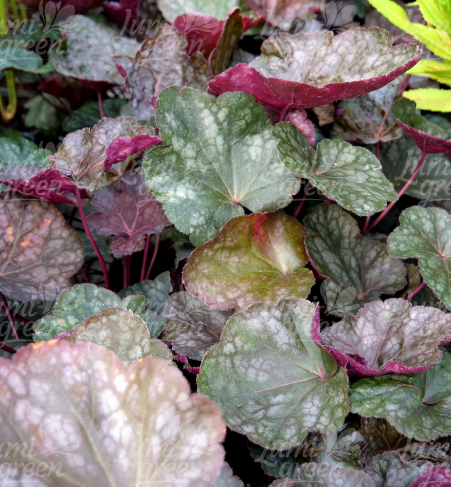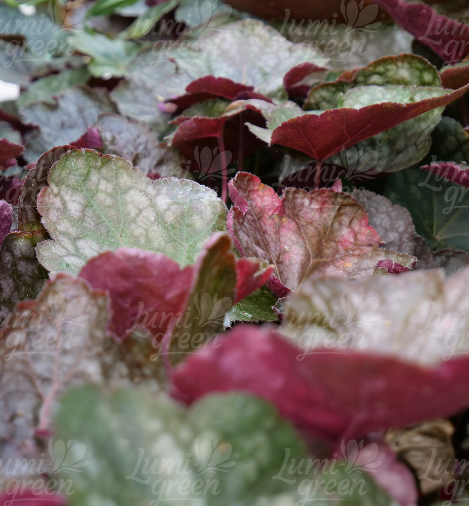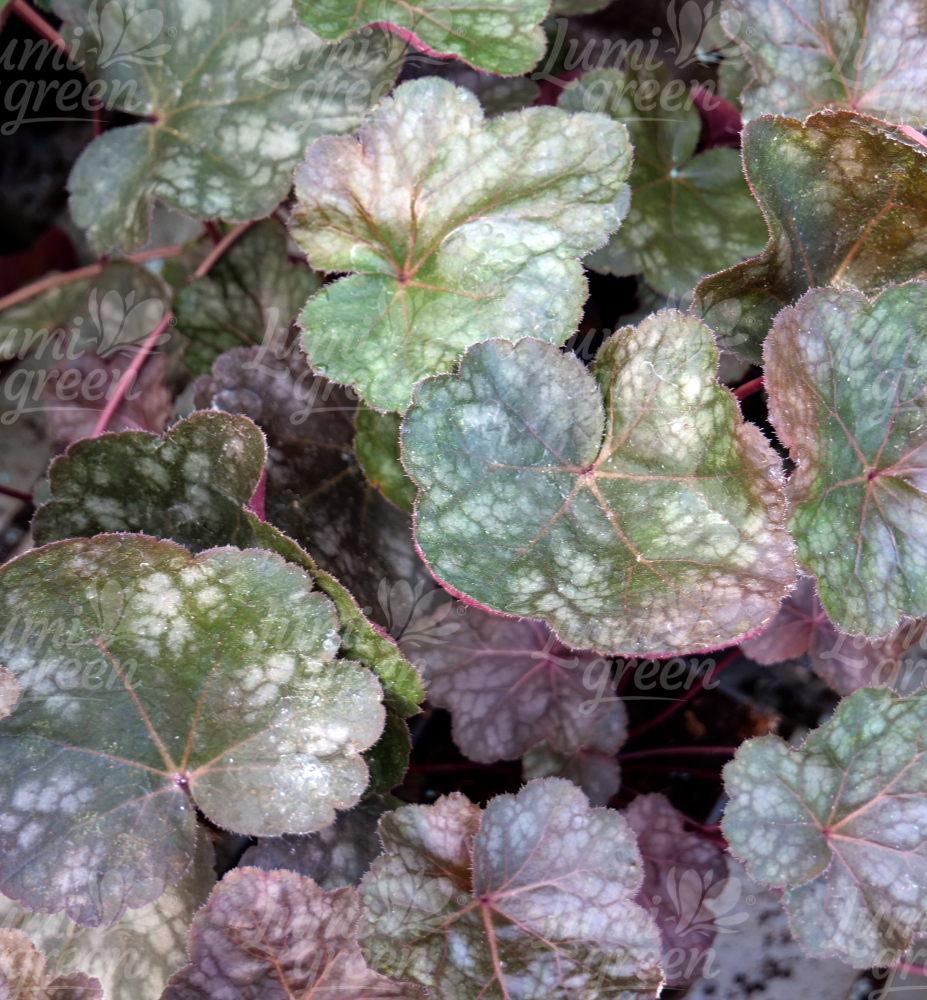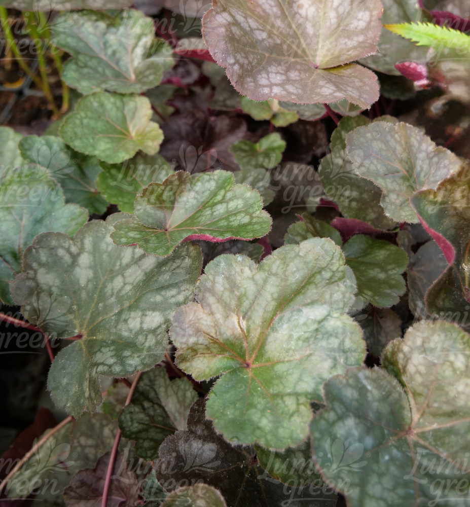 Eigenschaften: Purpurglöckche 'CHOCOLATE VEIL' ist eine unprätentiöse Sorte, die einen kompakten Haufen großer, dekorativer Blätter in dunklen Lila-, Grün- und Schokoladenbrauntönen hervorbringt. Der vorherrschende Farbton hängt vom Wachstumsstadium und der Pflanzposition ab. Die Blätter können mit leichten silbernen Flecken verziert sein. Sie blüht mit kleinen cremefarbenen, glockenförmigen Blütenständen, die an dünnen Stielen wachsen.