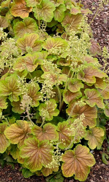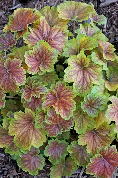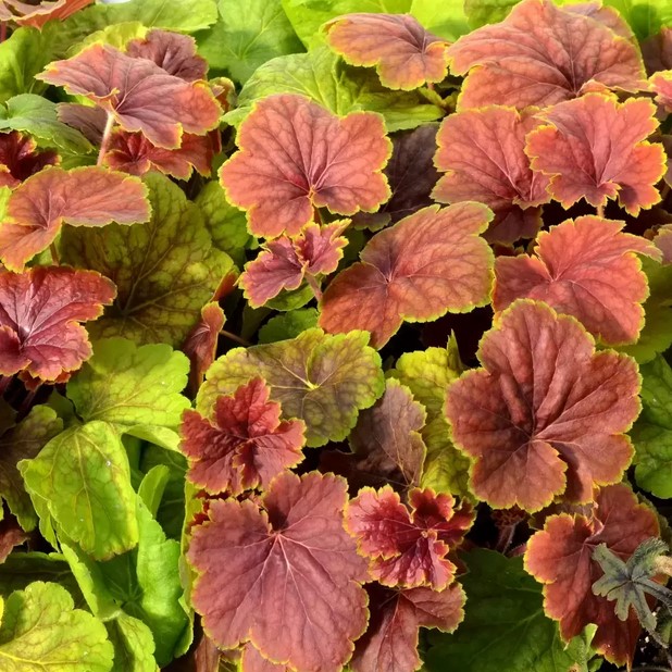 Eigenschaften: Die Sorte ´DELTA DAWN´ besticht durch ihre runden Blätter, die im Laufe der Saison ihre Farbe ändern. Die Blätter haben eine orangebraune bis rotbraune Farbe, die mit undeutlichen Adern bedeckt ist. Die Blattränder sind goldgelb. Im Sommer verfärben sie sich lindgrün mit roten Adern. Ab Juni erscheinen an kurzen Stielen kleine, cremeweiße Blüten. Diese Sorte zeichnet sich durch ihre typische Herbstfärbung aus und eignet sich daher für den Anbau in Herbsttöpfen. Sie lässt sich gut mit anderen Sorten mit farbigen Blättern kombinieren und bildet mit ihnen ein buntes Mosaik.