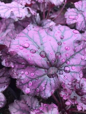 Fantastische violette, kompakte Heuchera mit glänzenden Blättern und gewellten Rändern.