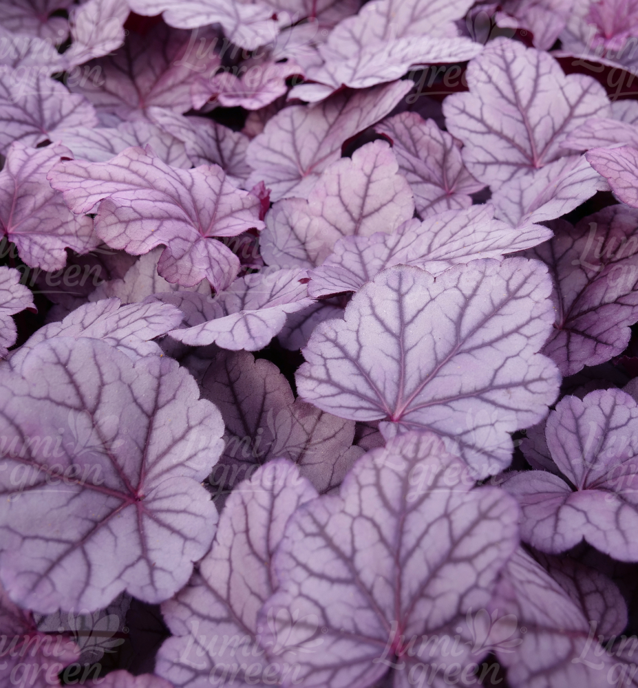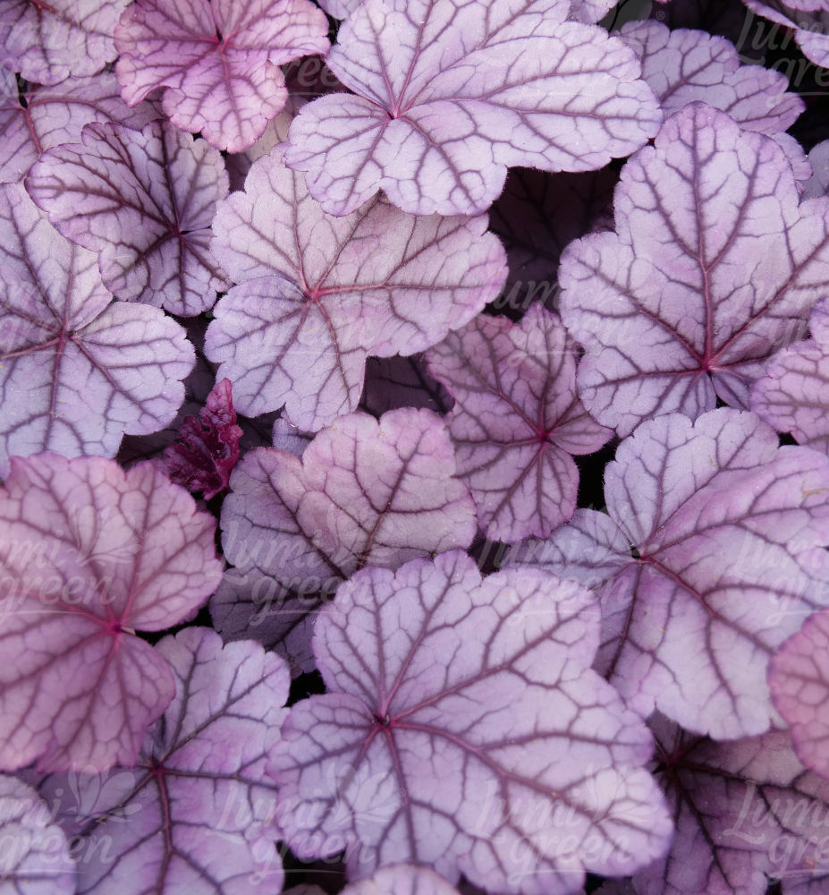Eine außergewöhnlich auffällige Purpurglöckche mit violett-rosa Blättern mit dunklen Adern.