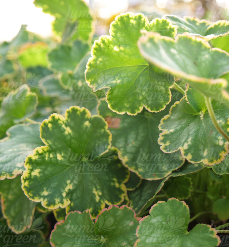 Eine niedrige, immergrüne, mehrjährige Pflanze mit grünen Blättern mit silberner Panaschierung und roten Blüten.