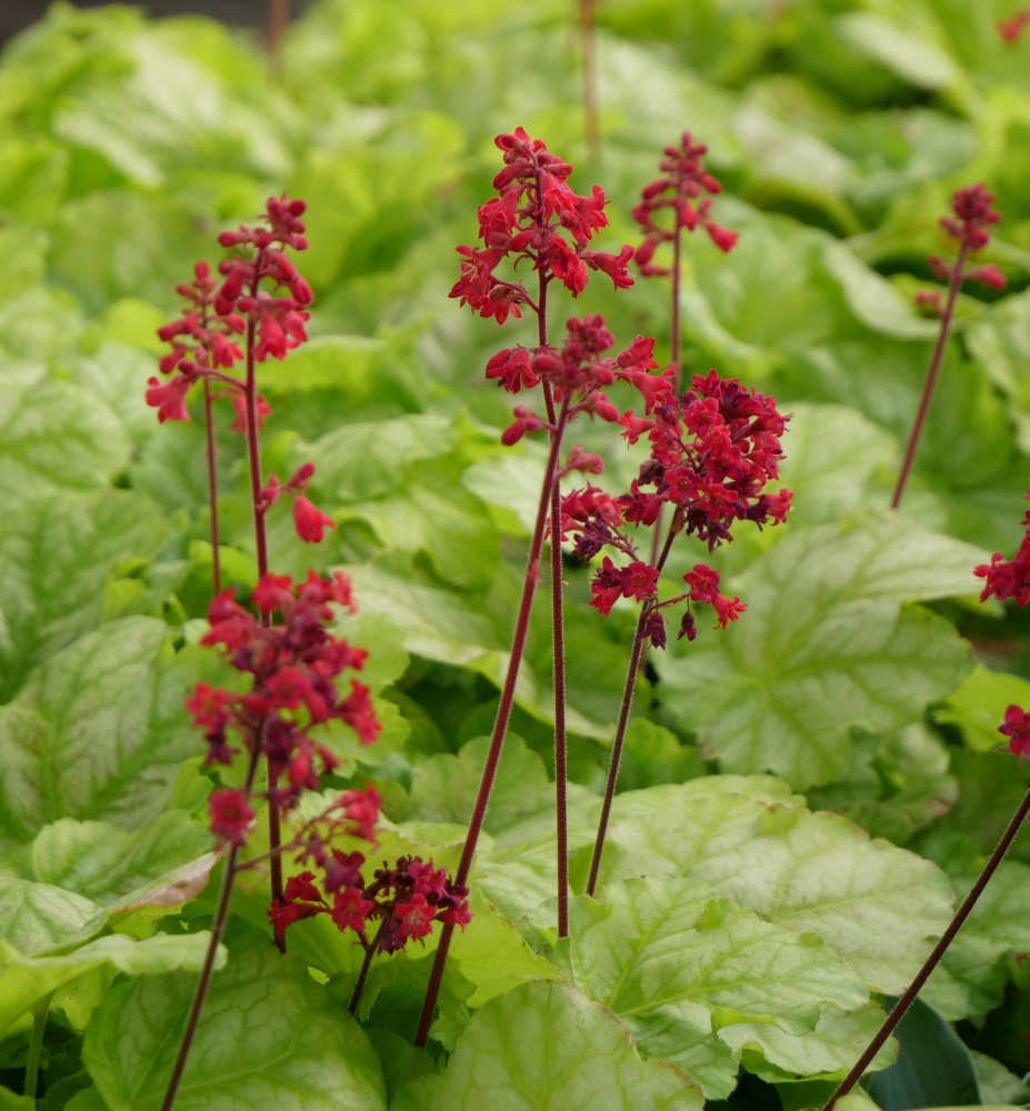 Attraktive grüne Purpurglöckche mit markanten blutroten Blüten.
