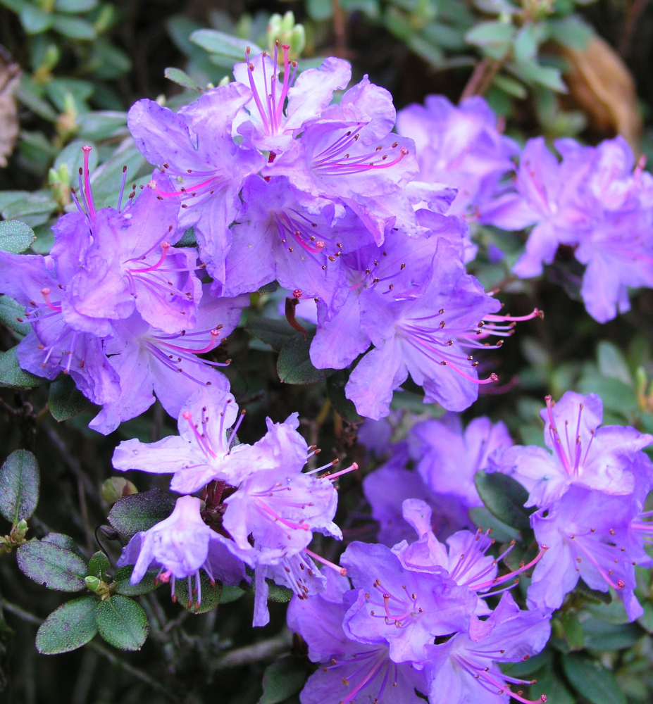 Ein niedrig wachsender Rhododendron mit vielen hellvioletten Blüten.