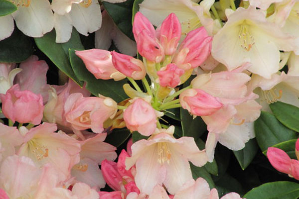Wunderschöner, reich blühender Rhododendron mit sanften Rosa- und Gelbtönen.