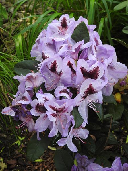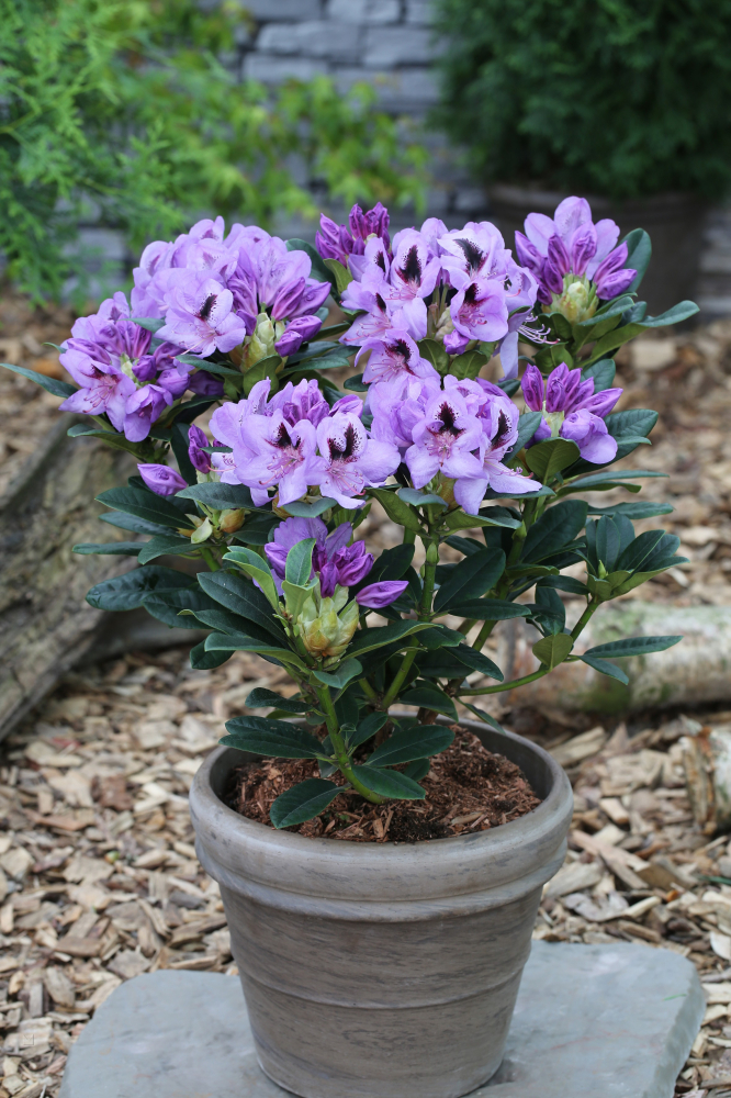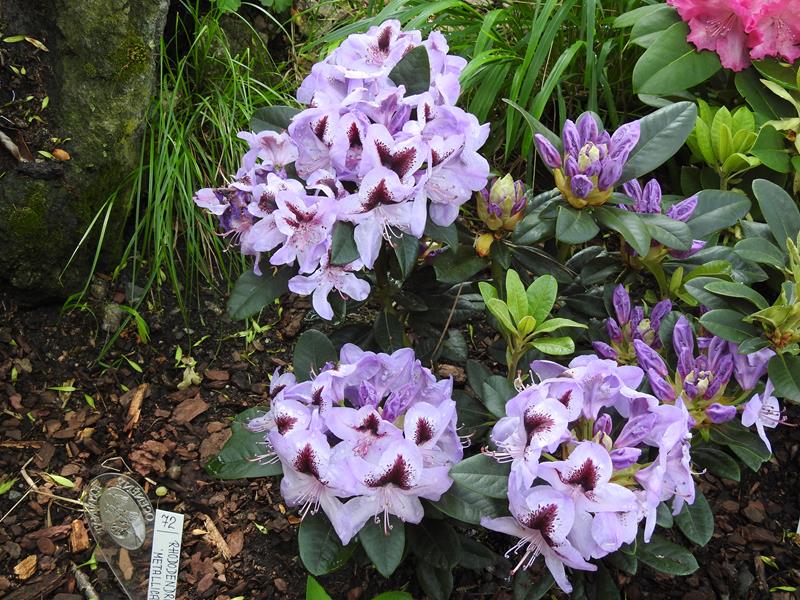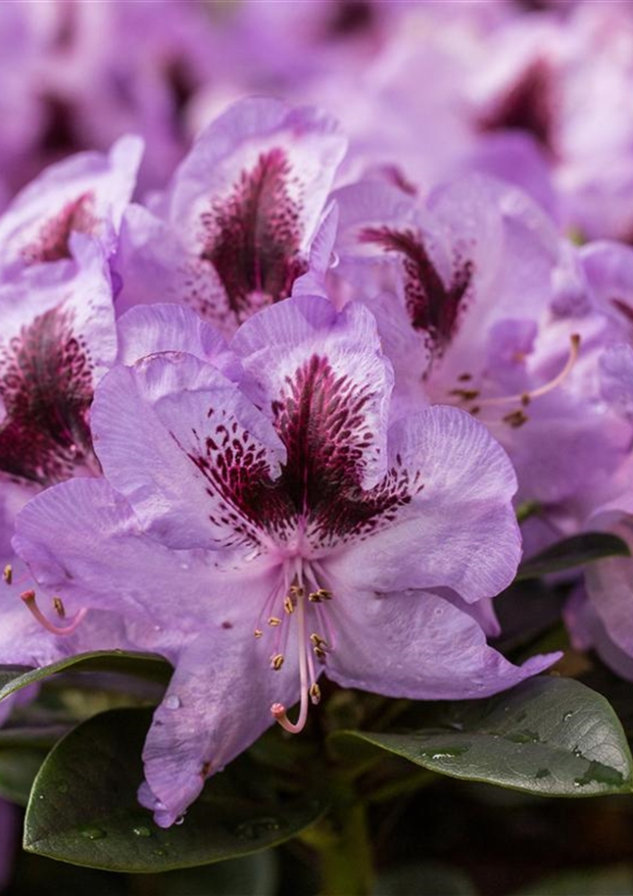 Eigenschaften: Der Rhododendron 'METALLICA' bildet einen leicht ausladenden Strauch mit dichtem, immergrünem Laub. Ende Mai, wenn viele andere Rhododendren bereits verblüht sind, öffnet diese Sorte ihre großen, glockenförmigen, hellvioletten Blüten. Die oberen Blütenblätter sind mit einem weinroten Muster geschmückt. Die großen, ledrigen Blätter sind dunkelgrün und glänzend.