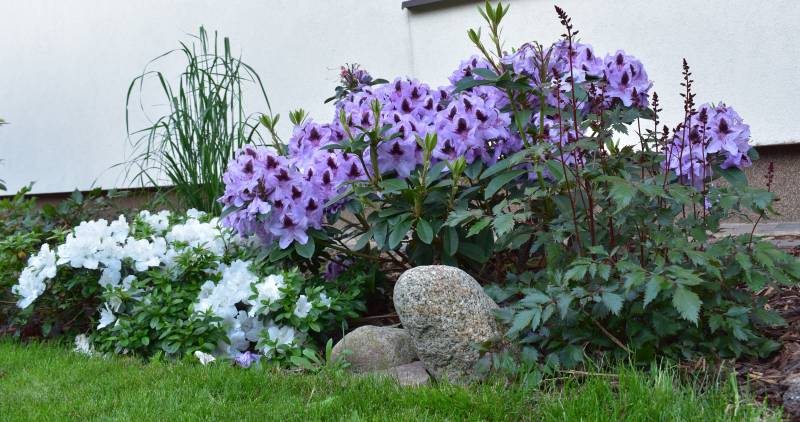 Anbau: Rhododendren werden aufgrund ihres flachen Wurzelsystems nicht zu tief gepflanzt. Beim Pflanzen sollte dem Boden ein spezielles Substrat für Azaleen und Rhododendren beigemischt werden, um den optimalen pH-Wert sicherzustellen. Da Rhododendren empfindlich auf stauende Nässe reagieren, kann das Substrat zur besseren Durchlüftung mit Rinde oder Nadeln aufgelockert werden. Nach dem Pflanzen empfiehlt sich eine Mulchschicht aus Rinde, um die Feuchtigkeit im Boden zu halten. Rhododendren gedeihen am besten an einem halbschattigen bis schattigen Standort.