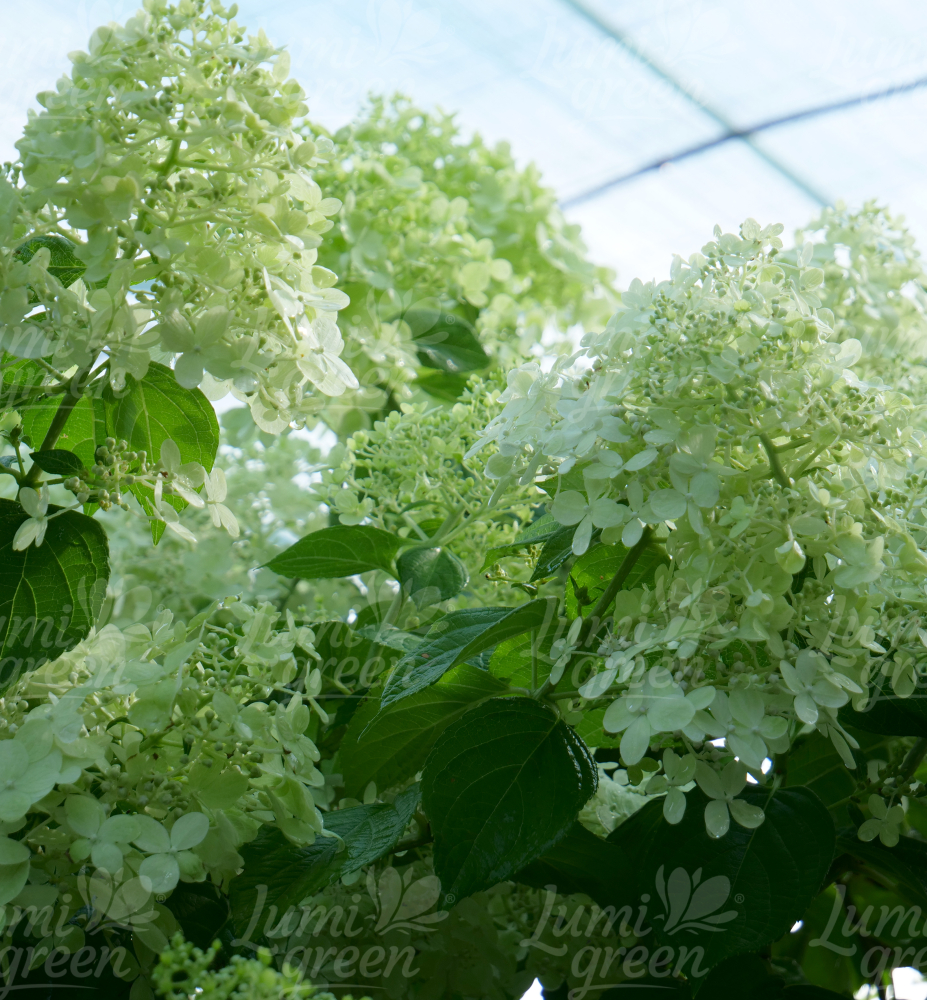 Eigenschaften: Die Rispenhortensie ´LIMELIGHT®‘ ist eine robuste Neuheit aus den Niederlanden. Sie zeichnet sich durch Blütenstände von bis zu 30 cm aus, die im Laufe der Saison ihre Farbe verändern – zu Beginn der Blüte sind sie grünweiß und nehmen gegen Ende des Sommers einen leuchtend altrosa Farbton an. Die Blätter sind oval, mittelgroß und dunkelgrün. Die Pflanze erreicht eine Höhe von 1,5–2 m; bei Bedarf kann ein geringerer Wuchs durch Rückschnitt aufrechterhalten werden. Wind, Regen und volle Sonne werden von der Sorte gut vertragen.