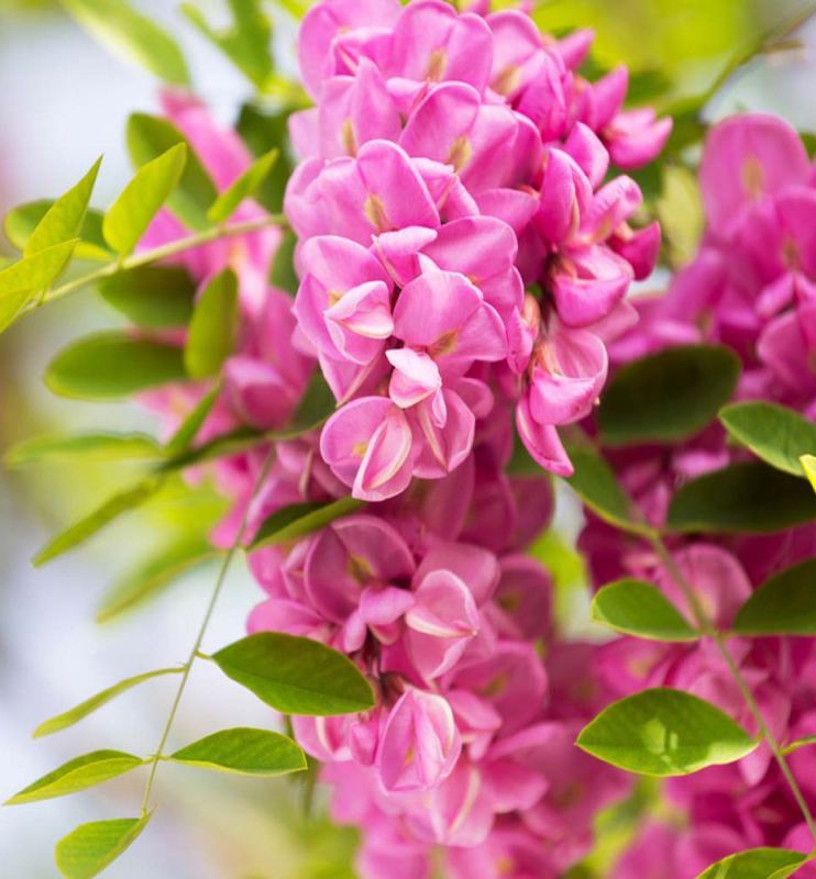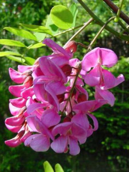 Eigenschaften: Robinie ´CASQUE ROUGE´ (syn. Pink Cascade) bildet einen Laubbaum (größerer Strauch) mit einer unregelmäßig abgerundeten Krone. Die Zweige hängen leicht über. Sie erreicht eine maximale Höhe von 8 m. Die Blätter wachsen paarweise an den Trieben, haben eine frische grüne Farbe, die jungen Blätter nehmen beim Austrieb jedoch einen Bronzeton an. An der Wende von Frühling und Sommer entstehen üppige Blumenkaskaden aus wunderschönen rosa Blüten, die einen intensiven Duft um sich herum verbreiten. Die Blüten wachsen in bis zu 15 cm langen Büscheln. Sie eignet sich hervorragend als Solitär, eignet sich aber auch für Stadt- und Parkbepflanzungen.