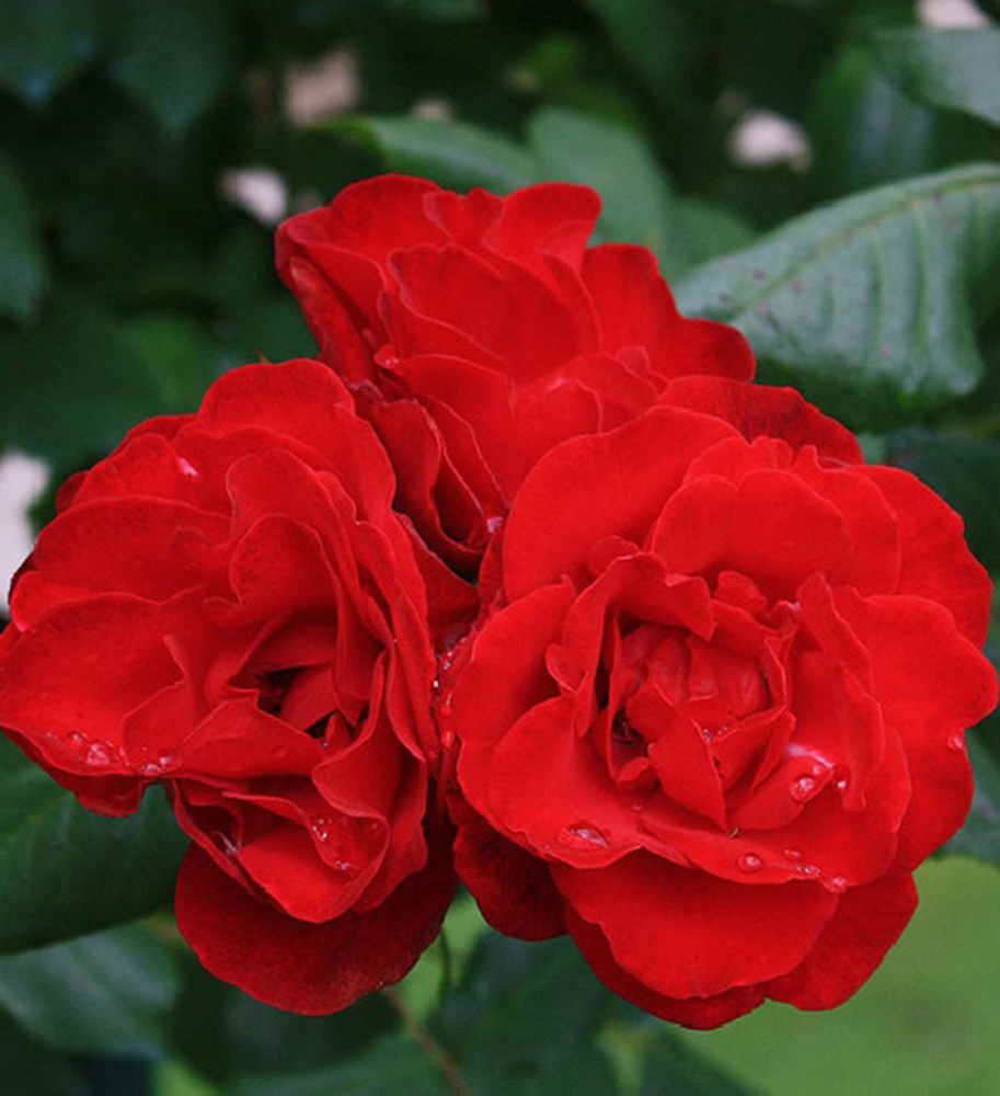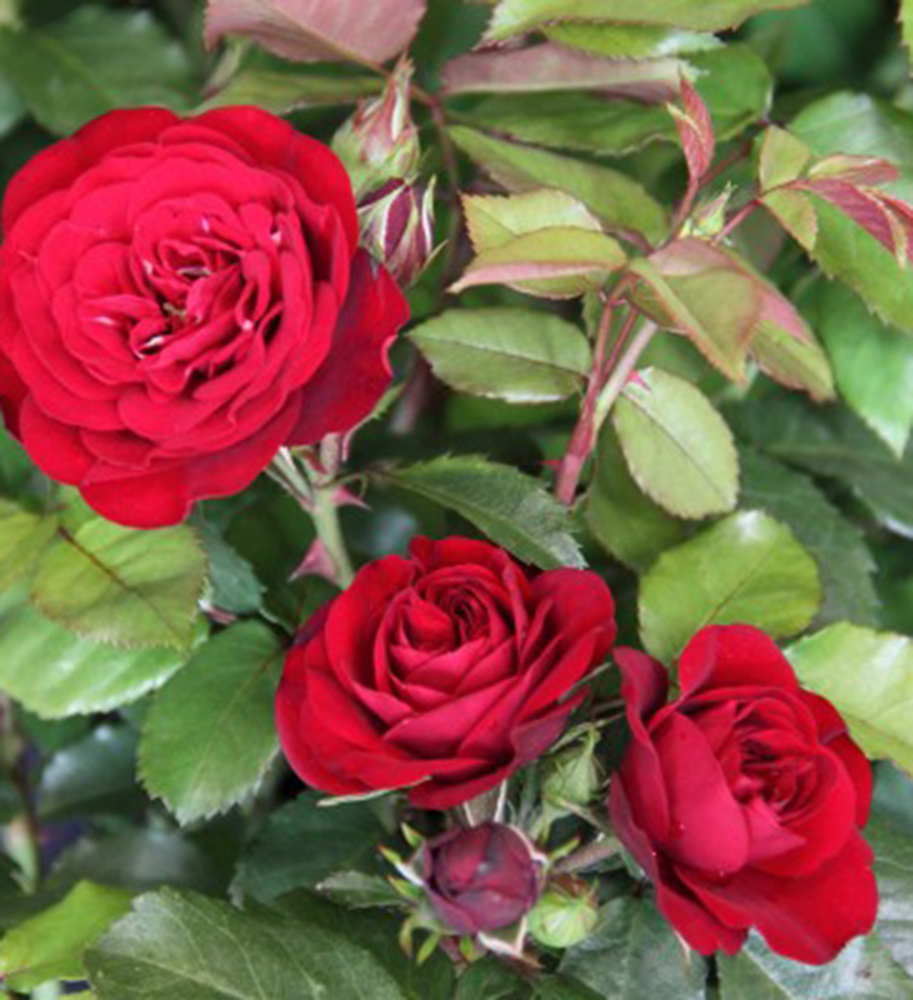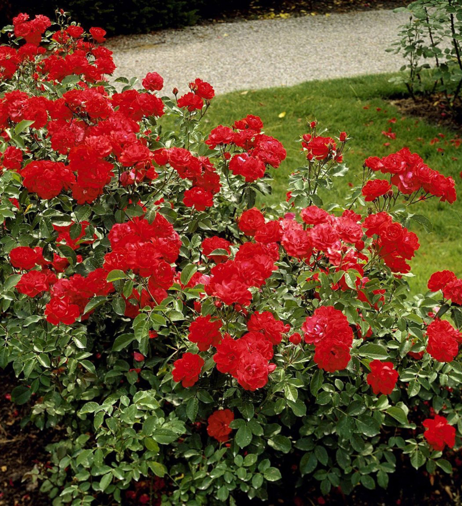 Eine sehr beliebte Beetrose mit samtigen, leuchtend roten Blüten.