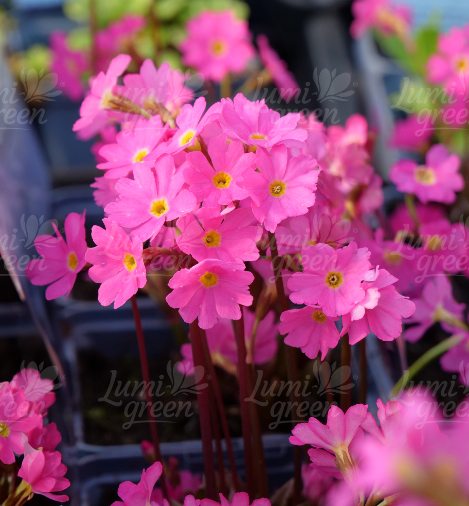 Eigenschaften: Die Rosen-Primel ist eine beliebte, mehrjährige Pflanze aus dem Himalaya, wo sie von Afghanistan bis zum südöstlichen Tibet und nach China in feuchten, wassergesättigten Böden wächst. Der lateinische Name bedeutet übersetzt „erste Blume“. Die Pflanze bildet Grundrosetten aus hellgrünen Blättern. Sie blüht an der Wende von März und April mit großen, leuchtend rosafarbenen Blüten in einem auffälligen Blütenstand. Zu Beginn der Entwicklung erscheinen die Blüten dicht zwischen den austreibenden Blättern; während der Blüte verlängert sich der Stiel und erreicht eine Höhe von 10–25 cm.