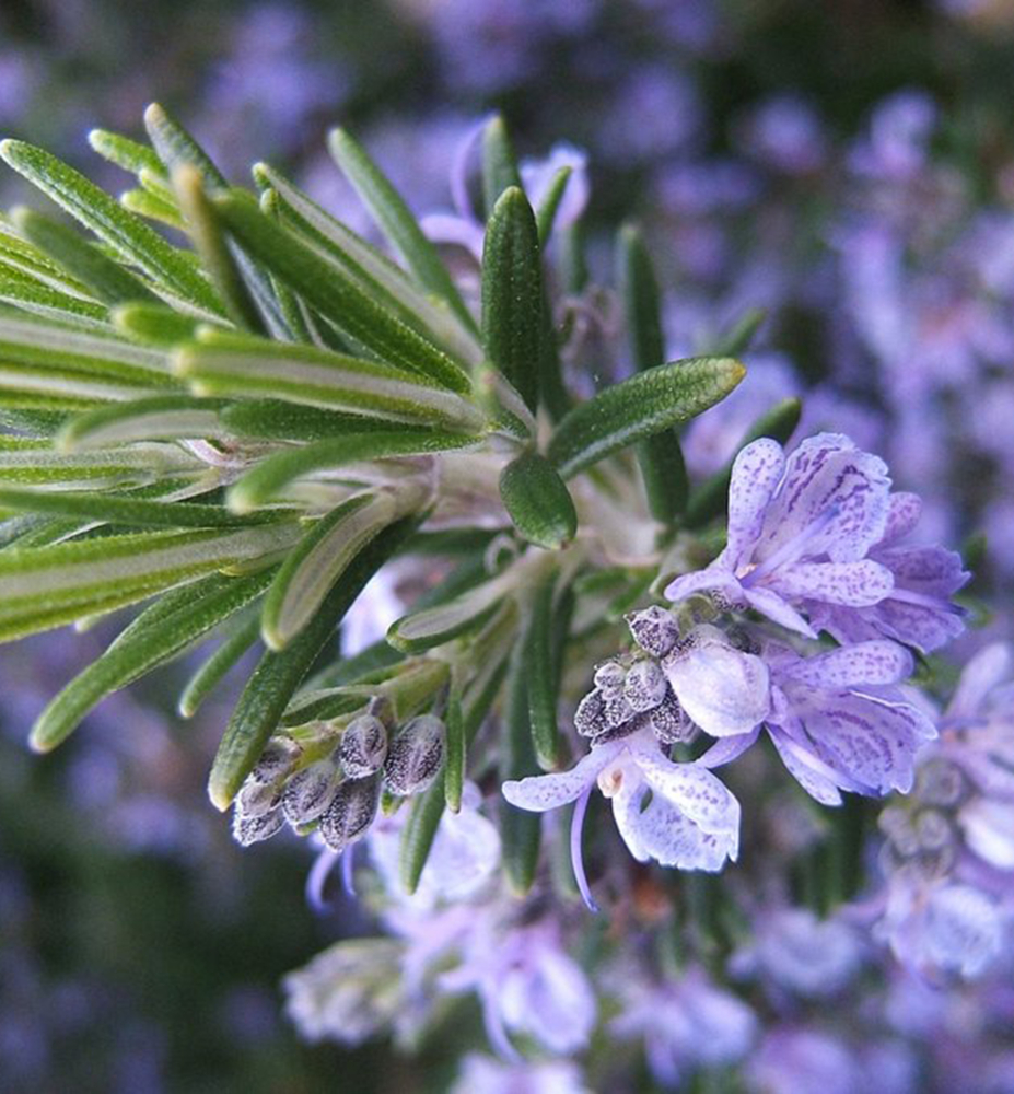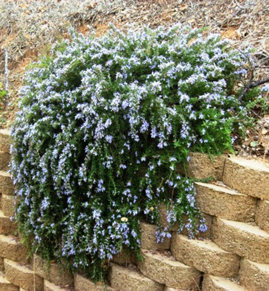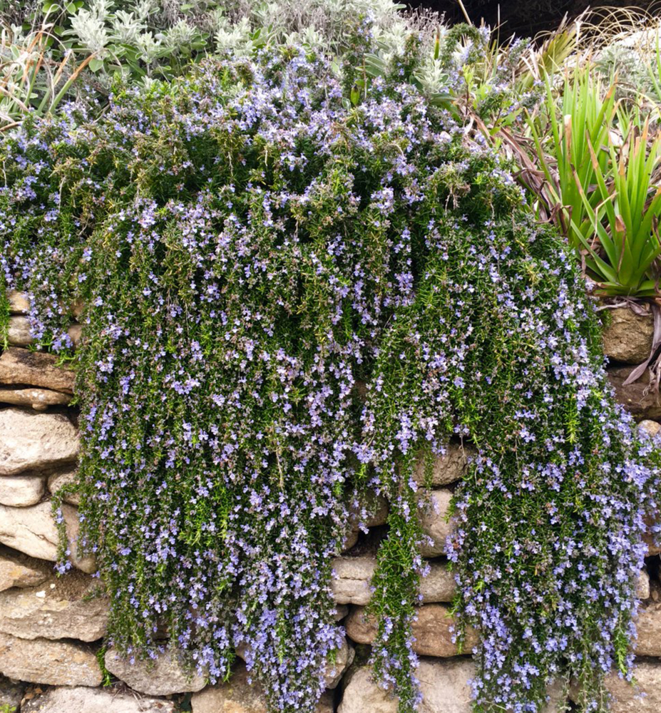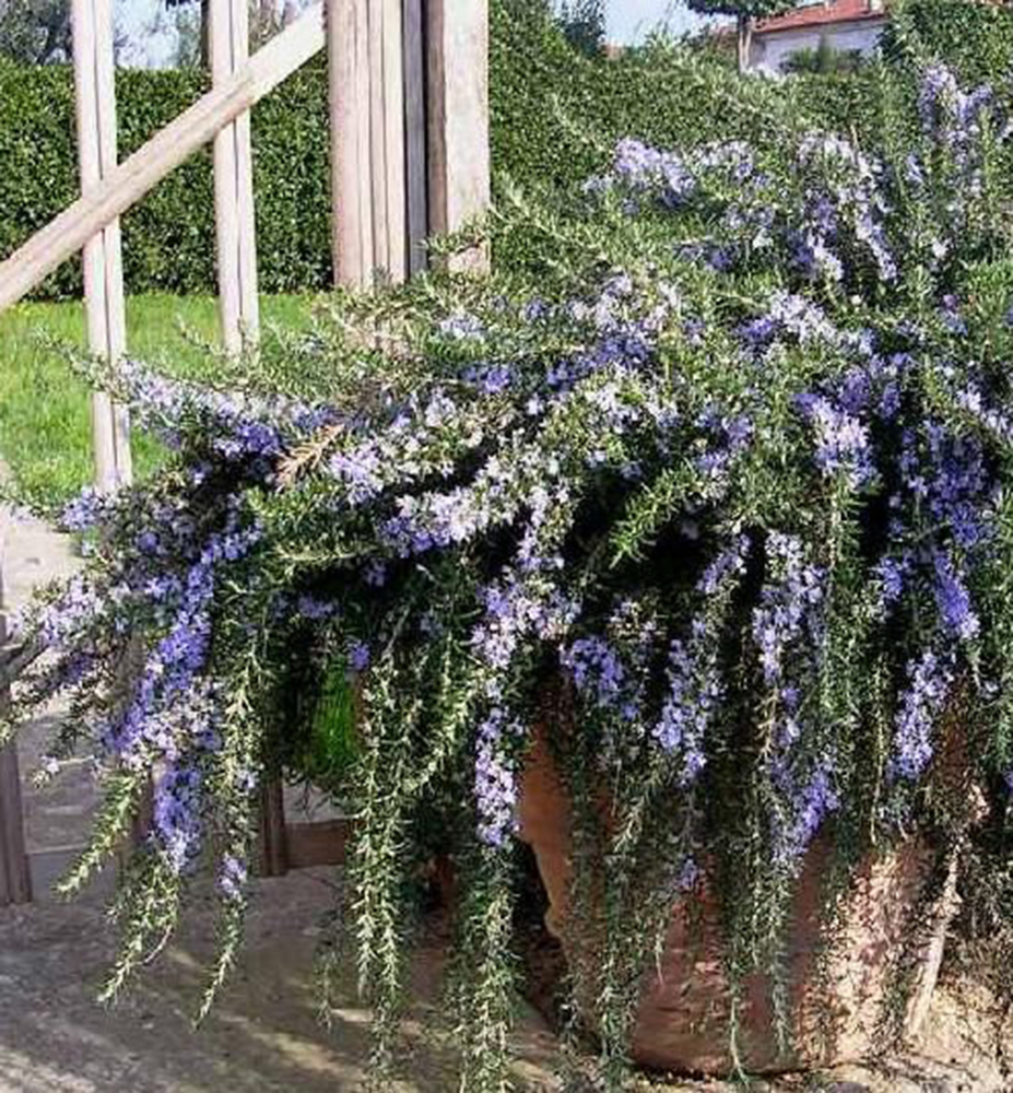 Eigenschaften: Rosmarin „Prostratus“ ist eine überhängende Sorte mit linearen silbergrünen Blättern und hellblau-violetten Blüten. Rosmarin wird in der Küche vor allem zum Würzen von Fleisch, Fisch und Kartoffeln verwendet.