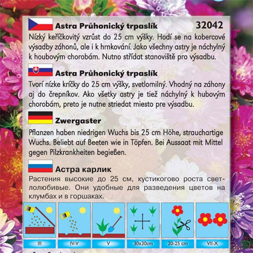Eigenschaften:Astra ist eine aufrecht wachsende, verzweigte einjährige Pflanze, die zum Schneiden und Pflanzen in Blumenbeeten bestimmt ist. Die Blätter sind eiförmig und gezähnt. Sorte „PINOCCHIO SCARLET“ – ist eine sehr attraktive, verzweigte Aster mit einer Höhe von 20–25 cm, kompaktem Wuchs, üppiger Blüte mit kleinen, vollen Blüten.