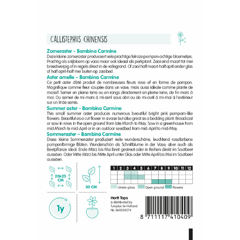 Eigenschaften:Die Aster ist eine aufrecht wachsende, verzweigte Sommerblume, die sowohl für den Schnitt als auch für Beetpflanzungen geeignet ist. Die Blätter sind eiförmig und gezähnt. Die Aster hat einen kompakten Wuchs. Die Sorte „Bambina Carmine“ blüht reichlich mit vielen schönen, leuchtend rosa Blüten. Sie kann direkt im Beet, aber auch in Töpfen kultiviert werden. Anbau:Astersamen werden zwischen Februar und März im Gewächshaus und von April bis Mai in Beeten oder Töpfen im Freien ausgesät. Drücken Sie die Samen vorsichtig in die Erde und bedecken Sie sie mit Erde. Wir entfernen verblühte Blüten, um eine lange Blüte zu fördern. Wir pflanzen Astra jedes Jahr an einem anderen Standort, sie benötigt ausreichend Sonne und lehmig-sandigen Boden mit genügend Nährstoffen. Von einer direkten organischen Düngung raten wir ab. Während der Vegetationsperiode behandeln wir Blattläuse.