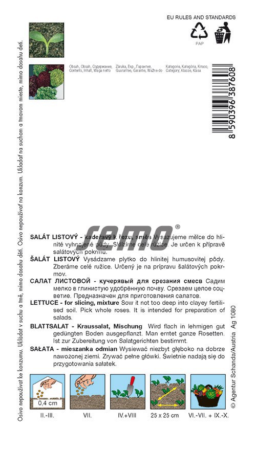Eigenschaften: Blattsortenmischung – FARBMISCHUNG – enthält mindestens 5 Blattsalatsorten: ROSET – lockig, hellrot bis rötlich, ZOLTÁN – lockig, hellgrün, CARMÍNA – leicht lockig, dunkelrot, Typ Lollo Rossa, ROSAURA – leicht gelockt, rötlich, ZLATAVA – leicht gelockt, gelbgrün, Typ Lollo Bionda, DUBARED – gelappt, glatt, dunkelrot, Typ Bowl Red, DUBAGOLD – gelappt, glatt, gelbgrün, Typ Schüssel Gelb. Es entstehen keine geschlossenen, festen Köpfe, sondern nur eine Ansammlung von Blättern unterschiedlicher Form und Farbe in Form flacher runder bis kugeliger Rosetten, die ähnlich wie beim Kopfsalat auf einmal abgeschnitten werden. Es ist eine ideale Wahl für Gemüsesalate, bei denen diese Samenmischung für eine Vielfalt an Farben sorgt.