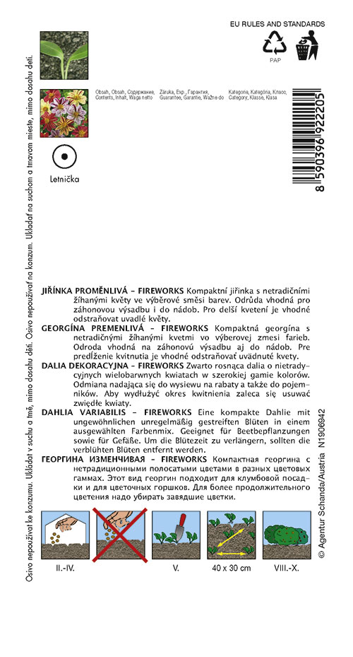 Eigenschaften:Dahlien stammen ursprünglich aus Guatemala und Mexiko. Es wurden viele Sorten gezüchtet, die sich in der Höhe der Pflanze, der Farbe und der Form der Blüte unterscheiden. Georgina „FIREWORKS“ ist eine buschig wachsende einjährige Pflanze mit auffällig roten Blüten. Die Packung enthält Samen mit verschiedenen Blütenfarben. Sie blüht sehr lange, von Juni bis Oktober. Sie wird als Einzelpflanze oder in Gruppen gepflanzt, sie kann aber auch in Kübeln kultiviert werden.