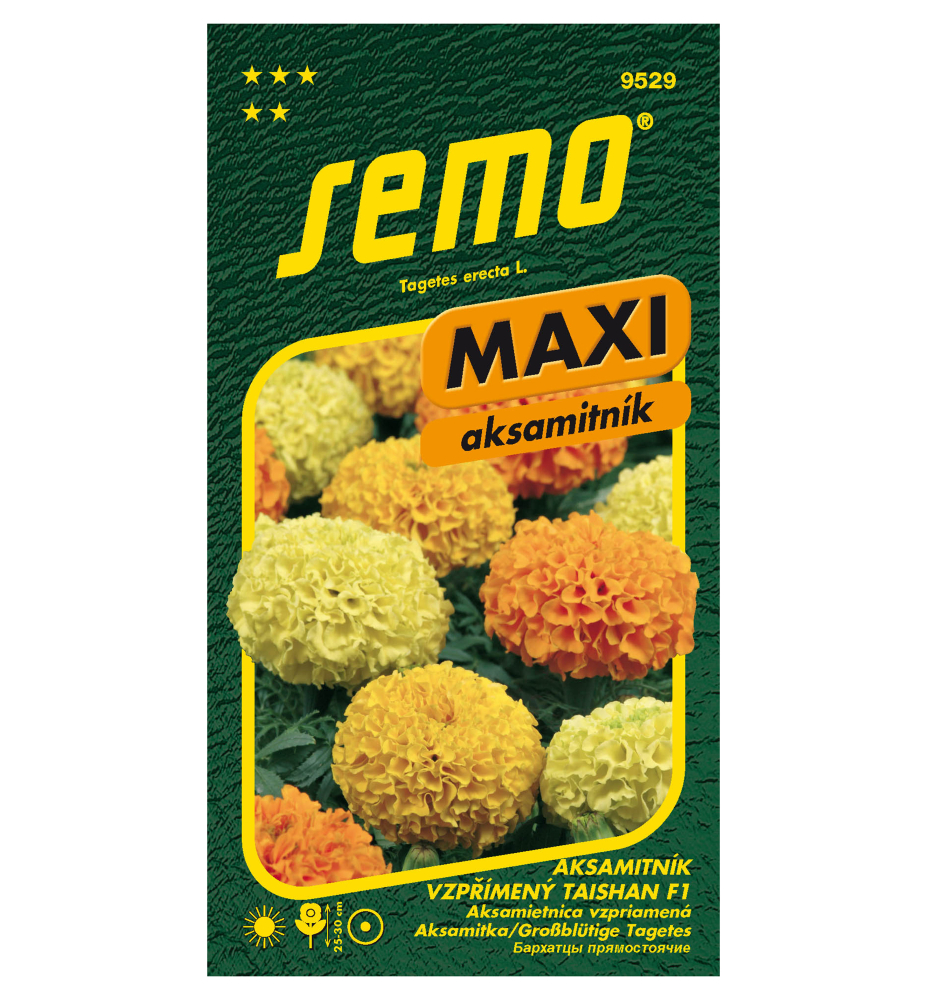 Eigenschaften: Velvets gehören zu den bekanntesten einjährigen Pflanzen, die auch als afrikanische oder stinkende Pflanzen bekannt sind. Die Blüten verbreiten einen spezifischen Duft um sich herum, der auf natürliche Weise schädliche Insekten abwehrt. Sie blühen sehr lange, die Blüten bilden sich die ganze Saison über kontinuierlich. Die Sorte „TAISHAN“ zeichnet sich durch sehr große, volle, kugelförmige Blüten aus, die an kräftigen Stielen wachsen. Die Packung enthält eine Mischung aus gelben, zitronengelben und orangefarbenen Blüten. Die Blätter sind geschnitten, dunkelgrün.