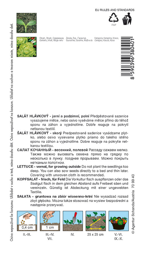 Anbau: Der Anbau erfolgt durch Transplantation oder direkte Aussaat an einem dauerhaften Ort. Abhängig vom vorgesehenen Erntezeitraum und der Beschaffenheit des Pflanzortes erfolgt die Aussaat ab der zweiten Februarhälfte. Salat wird in fruchtbaren, humosen, nicht versäuerten und lockeren Boden an einem sonnigen, warmen Standort gepflanzt.