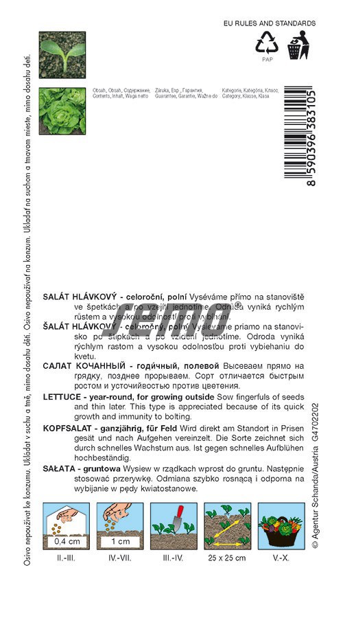 Anbau: Der Anbau erfolgt durch Transplantation oder direkte Aussaat an einem dauerhaften Ort. Abhängig vom vorgesehenen Erntezeitraum und der Beschaffenheit des Pflanzortes erfolgt die Aussaat ab der zweiten Februarhälfte. Frostbeständigkeit wird bis -5° angegeben. Salat wird in fruchtbaren, humosen, nicht versäuerten und lockeren Boden an einem sonnigen, warmen Standort gepflanzt.
