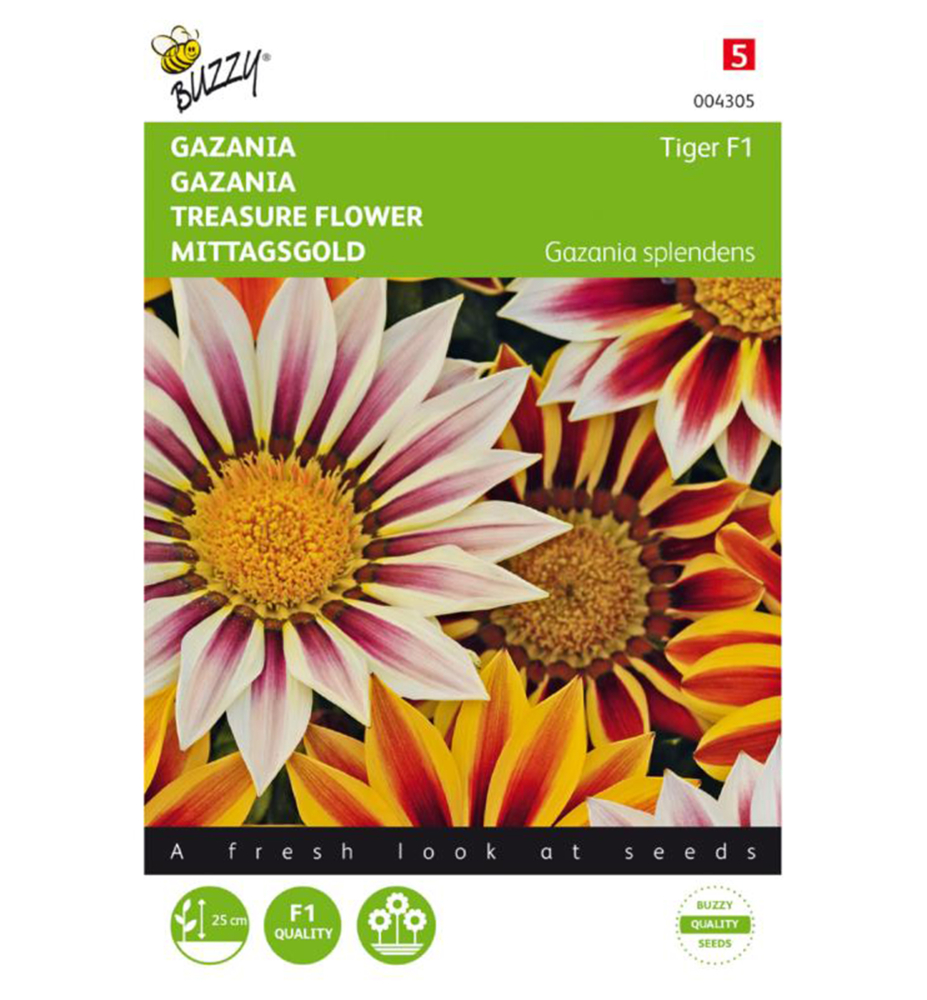 Eigenschaften: Tiger-Gazania-Samen bieten eine Mischung aus gestreiften Blüten in verschiedenen Farben. Gazania bildet eine Rosette aus gemahlenen Blättern, die eine lanzenförmige Form haben und auf der Unterseite mit weißlichem Filz bedeckt sind. Die kurzen Stängel tragen farbenfrohe Blüten, die recht groß (bis zu 12 cm) und sehr dekorativ sind. Die Pflanze wird 25 cm groß.